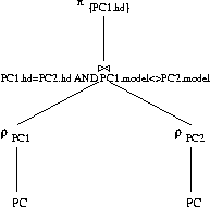 R3 = R1 JOIN_{PC1.hd = PC2.hd AND PC1.model <> PC2.model} R2
