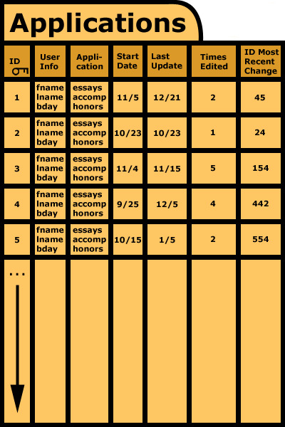 Applications The "Applications" table is keyed by ID. This is necessary because last and/or first names are not necessarily unique. Every record contains the personal information of the applicant (username, password, first name, last name, birthday, etc.). The next data set is the application itself. All required fields are integrated over a vertically connected record containing all relevant fields (essay, short answer, resume, grades, etc.) as well as all the information provided by third parties (school transcripts, test scores, etc.). The next two fields contain, respectively, the application's start date and its last date of change. The final two fields save the number of edits made to the application and the ID of the most recent change in the "Changes" table (keyed by ID).