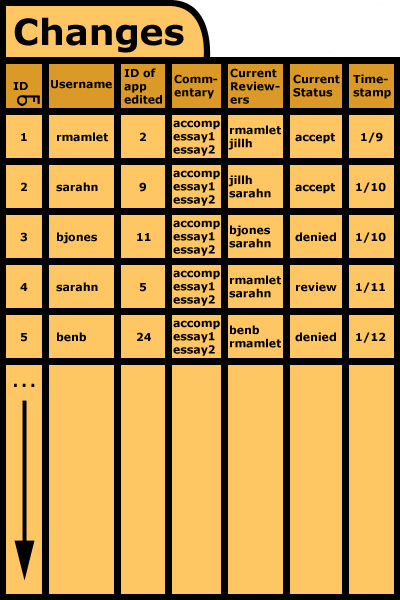 Changes The "Changes" table is keyed by ID, allowing an easy cross reference from the "Applications" table. Every record contains the username of the reviewer editing, the ID of the edited application, and a complete recording of the application's commentary fields. This system allows every change and comment ever made to be tracked specifically to a reviewer, allowing for 100% transparency in the review process. Furthermore, every record contains the names of all of the users who have ever edited the listed application, the current status of the application in question, and a timestamp identifying when the recorded changes were made.