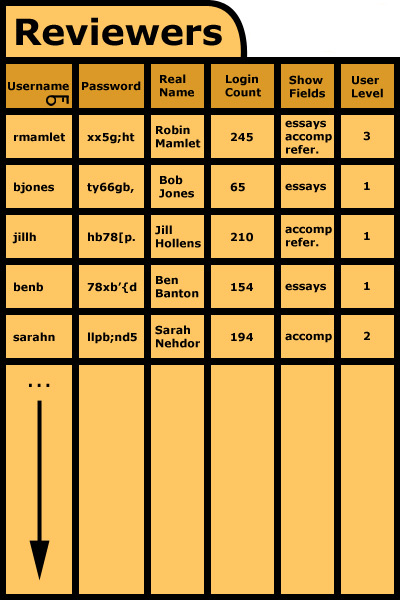 Reviewers The "Reviewers" table is keyed by username. This is possible because the username has to be a unique identifier in order to be useful for authentication purposes. The next two fields contain the password and the real name of the reviewer. In a set of columns following these first three, the personal preferences of the reviewer are saved. This allows the main website, for example, to show only the application fields that the reviewer wants to see. Lastly, the user's level is recorded. User levels identify the administrative privileges that are available to a specific user.