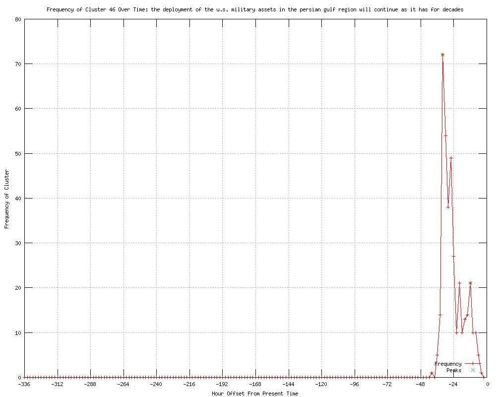 | 6 | deployment of us military assets in the persian gulf region will continue as it has for decades Urls http://au.news.yahoo.com/a/-/business/12489640/iran-warning-over-us-warship-raises-tensions-oil-prices/ http://au.news.yahoo.com/world/a/-/world/12489640/iran-warning-over-us-warship-raises-tensions-oil-prices/ http://au.news.yahoo.com/a/-/world/12489640/iran-warning-over-us-warship-raises-tensions-oil-prices/ http://sbs.com.au/news/article/1616411/Iran-s-US-warship-warning-raises-tensions http://godubai.com/gulftoday/article.asp?AID=77&Section=Main http://novinite.com/view_news.php?id=135366 |
