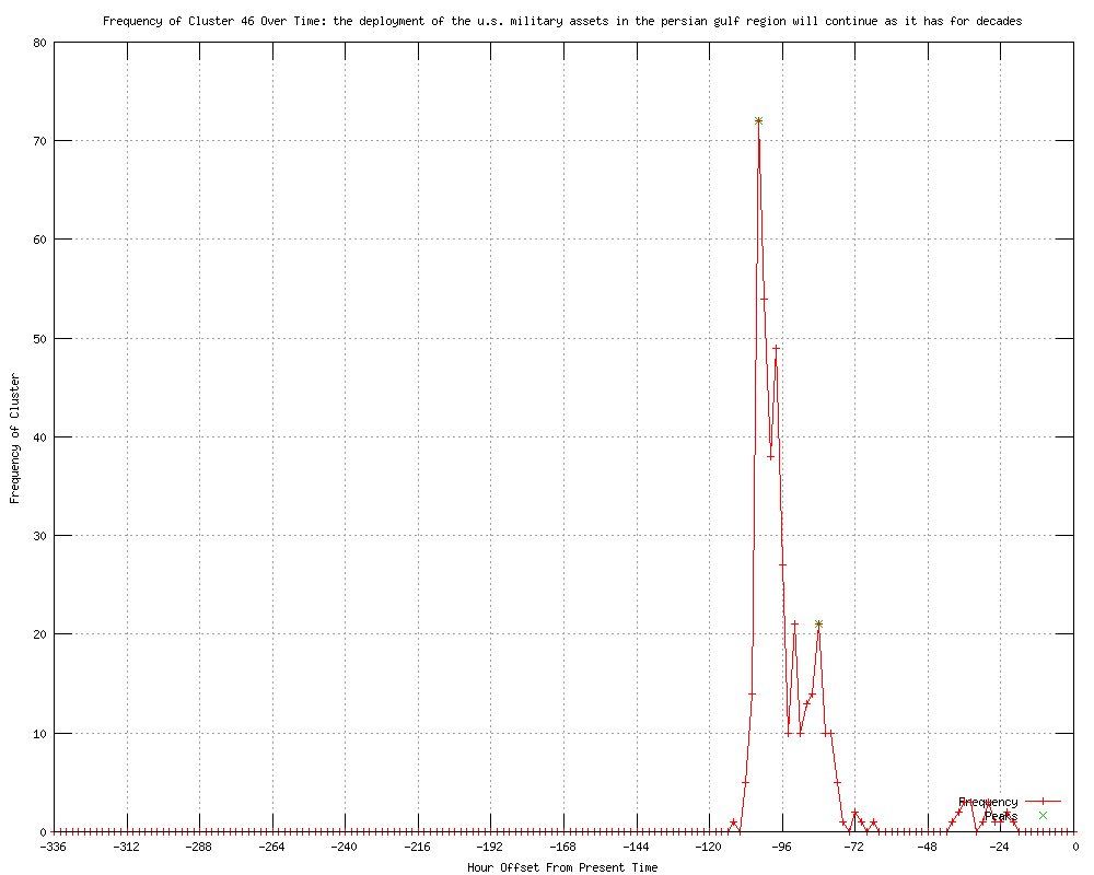 | 6 | deployment of us military assets in the persian gulf region will continue as it has for decades Urls http://au.news.yahoo.com/a/-/business/12489640/iran-warning-over-us-warship-raises-tensions-oil-prices/ http://au.news.yahoo.com/world/a/-/world/12489640/iran-warning-over-us-warship-raises-tensions-oil-prices/ http://au.news.yahoo.com/a/-/world/12489640/iran-warning-over-us-warship-raises-tensions-oil-prices/ http://sbs.com.au/news/article/1616411/Iran-s-US-warship-warning-raises-tensions http://godubai.com/gulftoday/article.asp?AID=77&Section=Main http://novinite.com/view_news.php?id=135366 |