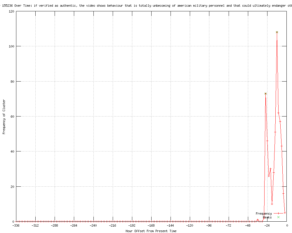 | 74 | if verified as authentic, the video shows behaviour that is totally unbecoming of american military personnel and that could ultimately endanger other soldiers and civilians Urls http://classicfm.co.uk/on-air/news-and-weather/uk-and-world/us-probes-marines-urinating-on-taliban-claim/ http://news.sky.com/skynews/Home/World-News/Inquiry-Into-US-Marines-Urinating-On-Taliban-Fighters-Video-Claim/Article/201201216147513?f=rss http://uk.news.yahoo.com/us-probes-marines-urinating-taliban-claim-005616977.html http://irn.co.uk/ViewNewsItem.aspx?ItemID=1607346 http://web.orange.co.uk/article/news/us_probes_marines_urinating_on_taliban_claim http://irn.co.uk/ViewNewsItem.aspx?ItemID=1607396 http://irn.co.uk/ViewNewsItem.aspx?ItemID=1607446 http://irn.co.uk/ViewNewsItem.aspx?ItemID=1607496 http://irn.co.uk/ViewNewsItem.aspx?ItemID=1607545 http://irn.co.uk/ViewNewsItem.aspx?ItemID=1607595 http://irn.co.uk/ViewNewsItem.aspx?ItemID=1607645 http://irn.co.uk/ViewNewsItem.aspx?ItemID=1607695 http://irn.co.uk/ViewNewsItem.aspx?ItemID=1607745 http://irn.co.uk/ViewNewsItem.aspx?ItemID=1607795 http://irn.co.uk/ViewNewsItem.aspx?ItemID=1607845 http://irn.co.uk/ViewNewsItem.aspx?ItemID=1607906 http://ctv.ca/CTVNews/TopStories/20120111/video-marines-urinating-corpses-120111/ http://ctv.ca/CTVNews/World/20120111/video-marines-urinating-corpses-120111/ http://winnipegfreepress.com/breakingnews/marines-probing-online-video-that-apparently-depicts-marines-urinating-on-battlefield-corpses-137137473.html http://cbc.ca/news/world/story/2012/01/11/marines-taliban-video-urinating.html?cmp=rss http://cbc.ca/news/world/story/2012/01/11/marines-taliban-video-urinating.html http://news.uk.msn.com/world/articles.aspx?cp-documentid=160261800 http://uk.express.feedsportal.com/c/33338/f/565858/s/1bbd9a28/l/0L0Sdailyexpress0O0Cposts0Cview0C2951620C0EUrinating0EMarines0Evideo0Eprobed0C/story01.htm http://uk.express.feedsportal.com/c/33338/f/565860/s/1bbdbb97/l/0L0Sdailyexpress0O0Cposts0Cview0C2951620C0EUrinating0EMarines0Evideo0Eprobed0C/story01.htm http://telegraph.feedsportal.com/c/32726/f/579330/s/1bbe71c9/l/0L0Stelegraph0O0Cnews0Cworldnews0Cnorthamerica0Cusa0C90A0A91840CMarines0Eurinating0Eon0ETaliban0Evideo0Eegregious0Eand0Eunacceptable0Esays0EPentagon0Bhtml/story01.htm http://telegraph.feedsportal.com/c/32726/f/564430/s/1bbe74ed/l/0L0Stelegraph0O0Cnews0Cworldnews0Cnorthamerica0Cusa0C90A0A91840CMarines0Eurinating0Eon0ETaliban0Evideo0Eegregious0Eand0Eunacceptable0Esays0EPentagon0Bhtml/story01.htm http://telegraph.feedsportal.com/c/32726/f/568435/s/1bbedd69/l/0L0Stelegraph0O0Cnews0Cworldnews0Cnorthamerica0Cusa0C90A0A91840CMarines0Eurinating0Eon0ETaliban0Evideo0Eegregious0Eand0Eunacceptable0Esays0EPentagon0Bhtml/story01.htm http://telegraph.feedsportal.com/c/32726/f/568301/s/1bbebc8f/l/0L0Stelegraph0O0Cnews0Cworldnews0Cnorthamerica0Cusa0C90A0A91840CMarines0Eurinating0Eon0ETaliban0Evideo0Eegregious0Eand0Eunacceptable0Esays0EPentagon0Bhtml/story01.htm http://Avusa.feedsportal.com/c/33051/f/534658/s/1bbf4244/l/0L0Stimeslive0Bco0Bza0Cworld0C20A120C0A10C120Ctaliban0Edenounce0Evideo0Eof0Eurinating0Eus0Esoldiers/story01.htm http://gulfnews.com/news/world/afghanistan/taliban-denounce-video-of-urinating-us-soldiers-1.965273 http://gulfnews.com/news/world/afghanistan/taliban-denounce-video-of-urinating-us-soldiers-1.965273?localLinksEnabled=false&utm_source=Feeds&utm_medium=RSS&utm_term=Most_viewed_RSS_&utm_content=1.965273&utm_campaign=Taliban_denounce_video_of_ http://telegraph.feedsportal.com/c/32726/f/568435/s/1bc0006c/l/0L0Stelegraph0O0Cnews0Cworldnews0Casia0Cafghanistan0C90A0A94720CUS0EMarines0Eurinating0Eon0Emen0Ebarbaric0Esays0ETaliban0Bhtml/story01.htm http://telegraph.feedsportal.com/c/32726/f/568301/s/1bbfd1e4/l/0L0Stelegraph0O0Cnews0Cworldnews0Casia0Cafghanistan0C90A0A94720CUS0EMarines0Eurinating0Eon0Emen0Ebarbaric0Esays0ETaliban0Bhtml/story01.htm http://telegraph.feedsportal.com/c/32726/f/564430/s/1bbffdc8/l/0L0Stelegraph0O0Cnews0Cworldnews0Casia0Cafghanistan0C90A0A94720CUS0EMarines0Eurinating0Eon0Emen0Ebarbaric0Esays0ETaliban0Bhtml/story01.htm http://telegraph.feedsportal.com/c/32726/f/564430/s/1bc0a688/l/0L0Stelegraph0O0Cnews0Cworldnews0Casia0Cafghanistan0C90A0A94720CHamid0EKarzai0Econdemns0EUS0EMarines0Eurinating0Evideo0Bhtml/story01.htm http://telegraph.feedsportal.com/c/32726/f/568301/s/1bc0f379/l/0L0Stelegraph0O0Cnews0Cworldnews0Casia0Cafghanistan0C90A0A94720CHamid0EKarzai0Econdemns0EUS0EMarines0Eurinating0Evideo0Bhtml/story01.htm http://irn.co.uk/ViewNewsItem.aspx?ItemID=1607956 http://irn.co.uk/ViewNewsItem.aspx?ItemID=1608006 http://irn.co.uk/ViewNewsItem.aspx?ItemID=1608046 http://irn.co.uk/ViewNewsItem.aspx?ItemID=1608096 http://irn.co.uk/ViewNewsItem.aspx?ItemID=1608144 http://news.sky.com/skynews/Home/World-News/US-Launches-Inquiry-Into-Claim-That-Video-Shows-Marines-Urinating-On-Dead-Taliban-Fighters/Article/201201216147513?f=rss http://irn.co.uk/ViewNewsItem.aspx?ItemID=1608194 http://irn.co.uk/ViewNewsItem.aspx?ItemID=1608244 http://irn.co.uk/ViewNewsItem.aspx?ItemID=1608296 http://actualdot.com/2012/01/12/us-probes-claim-marines-urinated-on-taliban/ http://rednecksrevenge.org/?p=6370 http://irn.co.uk/ViewNewsItem.aspx?ItemID=1608686 http://irn.co.uk/ViewNewsItem.aspx?ItemID=1608706 http://walesonline.co.uk/news/latest-world-news/2012/01/12/probe-launched-into-video-of-us-marines-urinating-on-corpses-91466-30107855/ http://independent.co.uk/news/world/asia/urinating-marines-video-investigated-6288433.html http://news.eircom.net/breakingnews/20284625/ http://dailyrecord.co.uk/news/uk-world-news/2012/01/12/us-marine-corps-chiefs-probe-video-of-soldiers-urinating-on-bodies-of-dead-taliban-insurgents-86908-23695518/ http://scotsman.com/probe_after_footage_released_of_marines_urinating_on_afghan_bodies_1_2050014 http://scotsman.com/news/international/probe_after_footage_released_of_marines_urinating_on_afghan_bodies_1_2050014 http://thisislondon.co.uk/standard/article-24027220-us-marines-urinated-on-taliban-