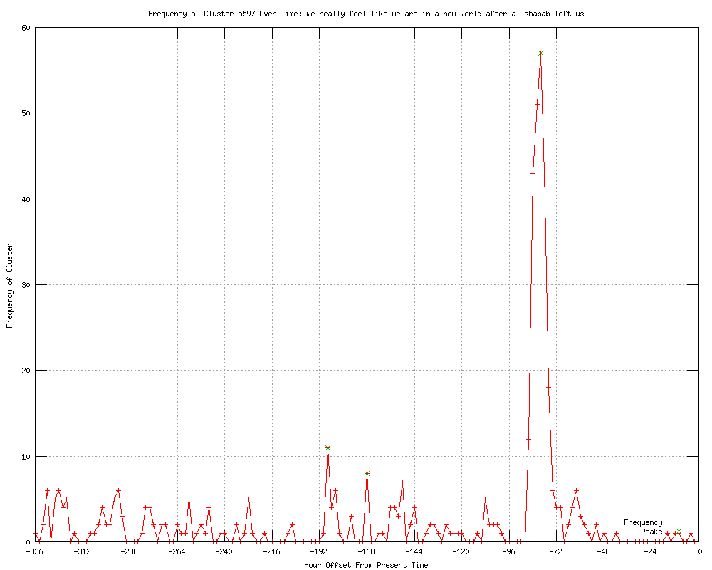 | 18 | we really feel like we are in a new world after al-shabab left us Urls http://guardian.co.uk/world/feedarticle/10020868 http://fortmilltimes.com/2012/01/02/1839693/somali-militants-gather-recruit.html http://washingtonpost.com/world/africa/somali-militants-gather-recruit-outside-town-taken-by-ethiopian-forces-calm-inside-town/2012/01/02/gIQAWqzsVP_story.html?wprss=rss_world http://wandtv.com/story/16428095/somali-militants-gather-recruit-at-border-town http://heraldonline.com/2012/01/02/3632052/somali-militants-gather-recruit.html http://khnl.com/story/16428095/somali-militants-gather-recruit-at-border-town http://startribune.com/world/136523753.html http://us.rd.yahoo.com/dailynews/rss/world/*http://news.yahoo.com/s/ap/20120102/ap_on_re_af/af_somalia_ethiopia http://feeds.washingtonpost.com/click.phdo?i=1bd80bbca3f186c91a4305b5faca2df1 http://washingtonpost.com/world/africa/somali-militants-gather-recruit-outside-town-taken-by-ethiopian-forces-calm-inside-town/2012/01/02/gIQAWqzsVP_story.html?wprss=rss_africa http://cbsnews.com/8301-501710_162-57350855/somali-militants-gather-recruit-at-border-town/ http://seattlepi.com/news/article/Somali-militants-gather-recruit-at-border-town-2436589.php http://abcnews.go.com/International/wireStory/somali-militants-gather-recruit-border-town-15272428 http://lakewyliepilot.com/2012/01/02/1379302/somali-militants-gather-recruit.html http://ctv.ca/CTVNews/World/20120102/somali-militants-recruiting-outside-beledweyne-120102/ http://feeds.cbsnews.com/%7Er/CBSNewsTravelGuru/%7E3/v7kKXgrhAgU/ http://hornofafrica-abdikarim.blogspot.com/2012/01/somali-militants-gather-recruit-outside.html http://washingtontimes.com/news/2012/jan/2/somali-militants-gather-recruit-at-border-town/?utm_source=RSS_Feed&utm_medium=RSS |
