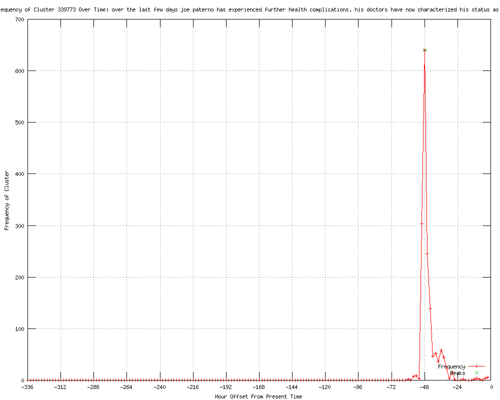 | 20 | over the last few days, joe paterno has experienced further health complications Urls http://twincities.com/sports/ci_19791445?source=rss http://twincities.com/news/ci_19791445?source=rss http://centredaily.com/2012/01/21/3061238/paterno-in-serious-condition.html#storylink=rss http://philly.com/r?19=961&43=168336&44=137828413&32=3796&7=195332&40=http%3A%2F%2Fwww.philly.com%2Fphilly%2Fsports%2Fcolleges%2F20120121_Joe_Paterno_in_serious_condition.html http://philly.com/r?19=961&43=168336&44=137828413&32=3796&7=195227&40=http%3A%2F%2Fwww.philly.com%2Fphilly%2Fsports%2Fcolleges%2F20120121_Joe_Paterno_in_serious_condition.html http://myfoxphoenix.com/dpp/sports/former-penn-state-coach-joe-paterno-has-died-01212012 http://sacbee.com/2012/01/21/4204940/former-penn-state-coach-joe-paterno.html#mi_rss=Top%20Stories http://sacbee.com/2012/01/21/4204940/former-penn-state-coach-joe-paterno.html#mi_rss=Latest%20News http://sfgate.com/cgi-bin/article.cgi?f=/c/a/2012/01/21/SPNE1MSQRO.DTL&feed=rss.sports http://wowt.com/sports/headlines/Paternos_Condition_Serious_Due_To_Cancer_Complications_137827773.html http://nytimes.com/2012/01/22/sports/ncaafootball/paterno.html http://nytimes.com/2012/01/22/sports/ncaafootball/paterno.html?partner=rss&emc=rss http://ajmbroadcasteducator.blogspot.com/2012/01/joe-pateno-is-not-dead-but.html http://centredaily.com/2012/01/22/3061687/paterno-fights-for-life.html#storylink=rss http://nypost.com/p/news/national/cancer_downturn_for_paterno_1O9XyTF0oFjGQu4mEI46yL?CMP=OTC-rss&FEEDNAME= http://ushotbuzz.blogspot.com/2012/01/paternos-condition-is-listed-as-serious.html http://nypost.com/p/news/national/cancer_downturn_for_paterno_1O9XyTF0oFjGQu4mEI46yL http://nypost.com/p/news/national/cancer_downturn_for_paterno_nbb3NlfD6Jder9xPHT67PM http://sfgate.com/cgi-bin/article.cgi?f=/c/a/2012/01/22/SPNE1MSQRO.DTL&feed=rss.sports http://nypost.com/p/news/national/former_penn_state_football_coach_p6mFnYfekrDB2yt8KGENjM?CMP=OTC-rss&FEEDNAME= |