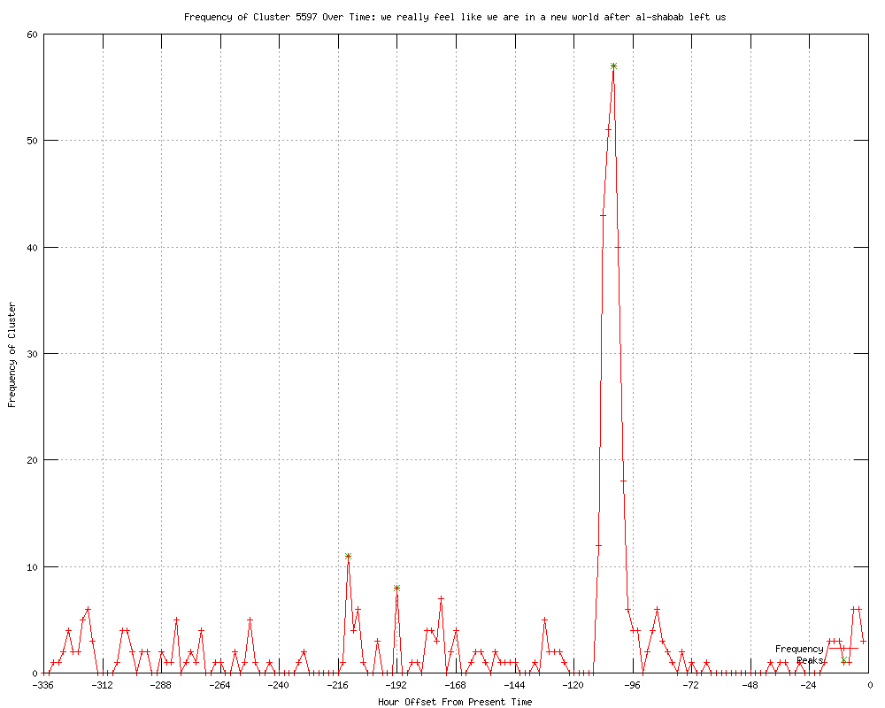 | 18 | we really feel like we are in a new world after al-shabab left us Urls http://guardian.co.uk/world/feedarticle/10020868 http://fortmilltimes.com/2012/01/02/1839693/somali-militants-gather-recruit.html http://washingtonpost.com/world/africa/somali-militants-gather-recruit-outside-town-taken-by-ethiopian-forces-calm-inside-town/2012/01/02/gIQAWqzsVP_story.html?wprss=rss_world http://wandtv.com/story/16428095/somali-militants-gather-recruit-at-border-town http://heraldonline.com/2012/01/02/3632052/somali-militants-gather-recruit.html http://khnl.com/story/16428095/somali-militants-gather-recruit-at-border-town http://startribune.com/world/136523753.html http://us.rd.yahoo.com/dailynews/rss/world/*http://news.yahoo.com/s/ap/20120102/ap_on_re_af/af_somalia_ethiopia http://feeds.washingtonpost.com/click.phdo?i=1bd80bbca3f186c91a4305b5faca2df1 http://washingtonpost.com/world/africa/somali-militants-gather-recruit-outside-town-taken-by-ethiopian-forces-calm-inside-town/2012/01/02/gIQAWqzsVP_story.html?wprss=rss_africa http://cbsnews.com/8301-501710_162-57350855/somali-militants-gather-recruit-at-border-town/ http://seattlepi.com/news/article/Somali-militants-gather-recruit-at-border-town-2436589.php http://abcnews.go.com/International/wireStory/somali-militants-gather-recruit-border-town-15272428 http://lakewyliepilot.com/2012/01/02/1379302/somali-militants-gather-recruit.html http://ctv.ca/CTVNews/World/20120102/somali-militants-recruiting-outside-beledweyne-120102/ http://feeds.cbsnews.com/%7Er/CBSNewsTravelGuru/%7E3/v7kKXgrhAgU/ http://hornofafrica-abdikarim.blogspot.com/2012/01/somali-militants-gather-recruit-outside.html http://washingtontimes.com/news/2012/jan/2/somali-militants-gather-recruit-at-border-town/?utm_source=RSS_Feed&utm_medium=RSS |