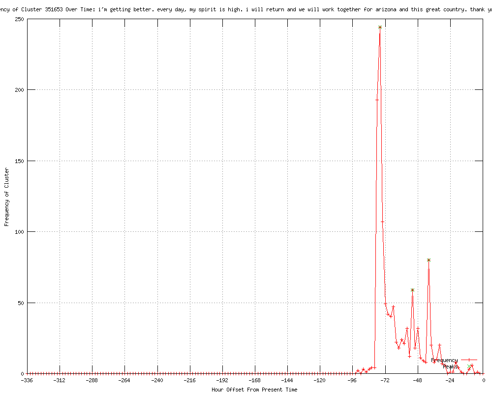 | 99 | i'm getting better. every day my spirit is high. i will return and we will work together for arizona and this great country. thank you very much Urls http://foxnews.com/politics/2012/01/22/giffords-to-resign-from-congress/ http://dailycaller.com/2012/01/22/rep-gabby-giffords-stepping-down-from-congress-%e2%80%98this-week%e2%80%99-video/ http://us.rd.yahoo.com/dailynews/rss/politics/*http://news.yahoo.com/s/dailycaller/20120122/pl_dailycaller/repgabbygiffordssteppingdownfromcongresse28098thisweeke28099video http://reuters.com/article/2012/01/22/us-usa-giffords-resignation-idUSTRE80L0RK20120122?feedType=RSS&feedName=topNews http://ca.reuters.com/article/topNews/idCATRE80L0RK20120122 http://reuters.com/article/2012/01/22/us-usa-giffords-resignation-idUSTRE80L0RK20120122?feedType=RSS&feedName=politicsNews http://feeds.reuters.com/~r/reuters/topNews/~3/ULP0ax8bnTo/us-usa-giffords-resignation-idUSTRE80L0RK20120122 http://reuters.com/article/2012/01/22/us-usa-giffords-resignation-idUSTRE80L0RK20120122?feedType=RSS&feedName=topNews&rpc=22&sp=true http://us.rd.yahoo.com/dailynews/rss/topstories/*http://news.yahoo.com/s/nm/20120122/pl_nm/us_usa_giffords_resignation http://news.yahoo.com/gabrielle-giffords-resigning-focus-recovery-youtube-193454630.html http://wnep.com/news/sns-rt-us-usa-giffords-resignationtre80l0rk-20120122,0,7641352.story http://publicbroadcasting.net/wkyu/news.newsmain/article/0/0/1896538/Top.Stories/Gabrielle.Giffords.resigning.to.focus.on.recovery http://fk.cm/6895367 http://reuters.com/article/2012/01/22/us-usa-giffords-resignation-idUSTRE80L0RK20120122 http://newsdaily.com/stories/tre80l0rk-us-usa-giffords-resignation/ http://feeds.reuters.com/%7Er/Reuters/PoliticsNews/%7E3/z17-9-bARXM/us-usa-giffords-resignation-idUSTRE80L0RK20120122 http://cnews.canoe.ca/CNEWS/World/2012/01/22/19278461.html?cid=rssnews http://ottawasun.com/2012/01/22/giffords-resigning-to-focus-on-recovery http://rocketnews.com/2012/01/gabrielle-giffords-resigning-to-focus-on-recovery/ http://jpost.com/International/Article.aspx?ID=254703&R=R1 http://calgarysun.com/2012/01/22/giffords-resigning-to-focus-on-recovery http://winnipegsun.com/2012/01/22/giffords-resigning-to-focus-on-recovery http://torontosun.com/2012/01/22/giffords-resigning-to-focus-on-recovery http://stuff.co.nz/timaru-herald/world/6299089/Gabrielle-Giffords-steps-down-from-Congress http://edmontonsun.com/2012/01/22/giffords-resigning-to-focus-on-recovery http://stuff.co.nz/world/americas/6299089/Gabrielle-Giffords-steps-down-from-Congress http://kgmi.com/Giffords-leaving-Congress-to-recover-from-shooting/11461903?newsId=123898 http://publicbroadcasting.net/wkyu/news.newsmain/article/0/0/1896554/Top.Stories/Giffords.leaving.Congress.to.recover.from.shooting http://thebarrieexaminer.com/ArticleDisplay.aspx?e=3445115 http://in.reuters.com/video/2012/01/22/us-rep-giffords-resigning-to-focus-on-re?videoId=228936294&feedType=VideoRSS&feedName=LatestVideosIN&videoChannel=117762 http://wsbt.com/news/sns-rt-us-usa-giffords-resignationtre80l0rk-20120122,0,4556468.story http://wsbt.com/sns-rt-us-usa-giffords-resignationtre80l0rk-20120122,0,2263942.story http://wsbt.com/news/sns-rt-us-usa-giffords-resignationtre80l0rk-20120122,0,4556468.story?track=rss http://canberratimes.com.au/news/world/world/general/universally-admired/2429041.aspx?src=rss http://reuters.com/video/2012/01/22/us-rep-giffords-resigning-to-focus-on-re?videoId=228936294&videoChannel=1 http://fox13now.com/sns-rt-us-usa-giffords-resignationtre80l0rk-20120122,0,4412826.story http://myvictoriaonline.com/content_page.php?contentType=4&contentId=9821753&fGId=21522&fGCTId=47&tempId=36264&tId=1&gId=1447 http://wbco.com/content_page.php?contentType=4&contentId=9821753&fGId=21522&fGCTId=47&tempId=46234&tId=1&gId=831 http://wsny.net/content_page.php?contentType=4&contentId=9821753&fGId=21522&fGCTId=47&tempId=26970&tId=1&gId=831 http://reuters.com/article/2012/01/23/us-usa-giffords-resignation-idUSTRE80L0RK20120123?feedType=RSS&feedName=politicsNews http://reuters.com/article/2012/01/23/us-usa-giffords-resignation-idUSTRE80L0RK20120123?feedType=RSS&feedName=topNews http://reuters.com/article/2012/01/23/us-usa-giffords-resignation-idUSTRE80L0RK20120123?feedType=RSS&feedName=topNews&rpc=22&sp=true http://us.rd.yahoo.com/dailynews/rss/topstories/*http://news.yahoo.com/s/nm/20120123/pl_nm/us_usa_giffords_resignation http://news.yahoo.com/giffords-leaving-congress-recover-shooting-001709441.html http://ca.reuters.com/article/topNews/idCATRE80L0RK20120123 http://reuters.com/article/2012/01/23/us-usa-giffords-resignation-idUSTRE80L0RK20120123 http://cnbc.com//id/46094166 http://feeds.reuters.com/~r/reuters/topNews/~3/Fd7fn1Za_0o/us-usa-giffords-resignation-idUSTRE80L0RK20120123 http://feeds.reuters.com/~r/Reuters/PoliticsNews/~3/RMpdtJgmxAk/us-usa-giffords-resignation-idUSTRE80L0RK20120123 http://rocketnews.com/2012/01/giffords-leaving-congress-to-recover-from-shooting/ http://wkzo.com/news/articles/2012/jan/22/giffords-leaving-congress-to-recover-from-shooting/ http://feeds.reuters.com/%7Er/Reuters/PoliticsNews/%7E3/RMpdtJgmxAk/us-usa-giffords-resignation-idUSTRE80L0RK20120123 http://reuters.com/video/2012/01/22/us-rep-giffords-resigning-to-focus-on-re?videoId=228936294&newsChannel=newsOne http://rocketnews.com/2012/01/giffords-leaving-congress-to-recover-from-shooting-2/ http://rocketnews.com/2012/01/giffords-leaving-congress-to-recover-from-shooting-3/ http://zeenews.india.com/news/world/giffords-leaving-congress-to-recover-from-shooting_754313.html http://jpost.com/VideoArticles/Video/Article.aspx?ID=254703&R=R1 http://allnews.rss.themalaysianinsider.com/c/33362/f/567634/s/1c0c092b/l/0L0Sthemalaysianinsider0N0Cworld0Carticle0Cgiffords0Eleaving0Eus0Econgress0Eto0Erecover0Efrom0Eshooting0C/story01.htm http://mf.feeds.reuters.com/c/871/f/605700/s/1c0ae619/l/0Luk0Breuters0N0Cvideo0C20A120C0A10C220Cus0Erep0Egiffords0Eresigning0Eto0Efocus0Eon0Ere0DvideoId0F2289362940GfeedType0FVideoRSS0GfeedName0