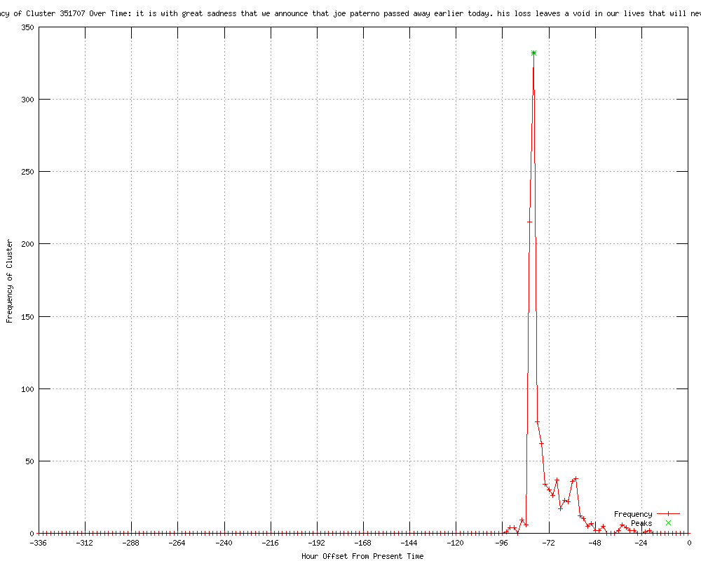 | 120 | it is with great sadness that we announce that joe paterno passed away earlier today Urls http://longislandpress.com/2012/01/22/joe-paterno-dead-at-85/ http://massappealnews.com/2012/01/22/joe-paterno-passes-away/ http://fox2now.com/sports/ktla-joe-paterno-cancer,0,3990964.story http://outsidethebeltway.com/joe-paterno-dead-at-85-family-conirms/ http://wik.io/info/US/310762772 http://outsidethebeltway.com/joe-paterno-dead-at-85-family-conirms/?utm_source=feedburner&utm_medium=feed&utm_campaign=Feed%3A+OTB+%28Outside+The+Beltway+%7C+OTB%29 http://tvguide.com/News/Joe-Paterno-Dies-1042113.aspx?rss=breakingnews http://omg.yahoo.com/news/former-penn-state-coach-joe-paterno-dies-160800988.html http://us.rd.yahoo.com/dailynews/rss/entertainment/*http://us.rd.yahoo.com/dailynews/external/omg_rss/rss_omg_en/news_former_penn_state_coach_joe_paterno_dies160800988/44264077/*http://omg.yahoo.com/news/former-penn-state-coach-joe-paterno-dies-160800988.html http://seattlepi.com/ae/tv/tvguide/article/Former-Penn-State-Coach-Joe-Paterno-Dies-2673789.php http://tvguide.com/News/Joe-Paterno-Dies-1042113.aspx?rss=keywords&partnerid=alltop&profileid=celebs http://wdsu.com/sports/30271370/detail.html http://cnn.com/2012/01/22/us/penn-state-paterno/index.html?hpt=hp_c1 http://cnn.com/2012/01/22/us/pennsylvania-obit-paterno/index.html?hpt=hp_t1 http://kbmt12.com/story/16573271/former-penn-state-coach-paterno-dead-at-85 http://edition.cnn.com/2012/01/22/us/pennsylvania-obit-paterno/index.html?eref=edition http://cnn.com/2012/01/22/us/pennsylvania-obit-paterno/index.html?eref=rss_latest http://rss.cnn.com/~r/rss/cnn_topstories/~3/FtdvBZRTBGY/index.html http://wesh.com/news/30272059/detail.html http://cnn.com/2012/01/22/us/pennsylvania-obit-paterno/index.html?eref=rss_topstories http://foxtricities.com/fox-tri-cities/30272059/detail.html http://ktxs.com/news/30272059/detail.html http://ktvz.com/news/30272059/detail.html http://nbcmontana.com/news/30272059/detail.html http://supertalk1570.com/includes/news_items/5/news_items_more.php?id=2371§ion_id=5 http://wsoctv.com/news/30272059/detail.html http://rss.cnn.com/~r/rss/cnn_latest/~3/ALEhSIxNoa0/index.html http://wxii12.com/news/30272059/detail.html http://thoroughlyandersoncooper.blogspot.com/2012/01/partial-end-of-sex-scandal.html http://wdsu.com/news/30272059/detail.html http://foxtricities.com/news/30272059/detail.html http://cnn.com/2012/01/22/us/pennsylvania-obit-paterno/index.html?hpt=hp_c1 http://cnn.com/2012/01/22/us/pennsylvania-obit-paterno/index.html?eref=rss_us http://edition.cnn.com/2012/01/22/us/pennsylvania-obit-paterno/index.html?eref=edition_us http://wibw.com/home/headlines/137848693.html http://edition.cnn.com/2012/01/22/us/pennsylvania-obit-paterno/index.html?eref=rss_us http://krcrtv.com/news/30272059/detail.html http://ozarksfirst.com/fulltext?nxd_id=590372 http://ksbw.com/news/30272059/detail.html http://wlwt.com/news/30272059/detail.html http://talkdelaware.com/general-news/19057-paterno-dies-age-85-a.html http://ladeeninet.blogspot.com/2012/01/opposing-views-issues-experts-answers_23.html http://theroot.com/joe-paterno-dead-at-85 http://privateinvesigations.blogspot.com/2012/01/joe-paterno-former-penn-state-football.html http://wibw.com/home/headlines/Legendary_Penn_State_Coach_Paterno_Dead_At_85_137848693.html http://wnep.com/wnep-paterno-loses-battle-with-cancerbb-20120122,0,2175393.story http://threedonia.com/archives/48290 http://opposingviews.com/i/sports/ncaa-football/big-ten/penn-state%E2%80%99s-joe-paterno-dead-age-85 http://wibw.com/nationalnews/headlines/Legendary_Penn_State_Coach_Paterno_Dead_At_85_137848693.html http://wlos.com/shared/newsroom/top_stories/videos/wlos_vid_6465.shtml?wap=0 http://wnep.com/wnep-paterno-loses-battle-with-cancerbb-20120122,0,2175393.story?track=rss http://justnews.com/news/Legendary-Penn-State-coach-Paterno-dead-at-85/-/1717324/8483116/-/14cdc4bz/-/index.html http://examiner.com/penn-state-nittany-lions-football-in-philadelphia/joe?cid=PROG-TagPage-HomepageHotTopic2-PaternoDeath http://eurweb.com/2012/01/joe-paterno-dead-85-lung-cancer/ http://wcti12.com/news/30272182/detail.html http://scottedwardphelps.blogspot.com/2012/01/on-maestrosand-mortals.html http://feeds.nydailynews.com/%7Er/nydnrss/news/%7E3/u2dsiyd_o9Q/story01.htm http://wibw.com/sports/headlines/Legendary_Penn_State_Coach_Paterno_Dead_At_85_137848693.html http://thelifeofluxury.com/ex-penn-state-football-coach-joe-paterno-has-died-at-age-85/ http://examiner.com/foster-care-adoption-in-national/did-sandusky-send-paterno-to-his-grave http://bilalaliproductions.com/sports-news/penn-state-coach-paterno-dead-at-85/ http://blackchristiannews.com/news/2012/01/joe-paterno-the-winningest-coach-in-major-college-football-dead-at-85.html http://wjhg.com/home/headlines/Joe_Paterno_Dies_Sunday_Morning__137848828.html http://ushotbuzz.blogspot.com/2012/01/joe-paterno-1926-2012-msnbccom.html http://au.news.yahoo.com/a/-/world/12688853/legendary-us-college-football-coach-joe-paterno-dies/ http://au.news.yahoo.com/a/-/business/12688853/legendary-us-college-football-coach-joe-paterno-dies/ http://kwtx.com/home/headlines/Ex-Penn_State_coach_Joe_Paterno_dead_at_85_137849373.html http://kwtx.com/_254sports/headlines/Ex-Penn_State_coach_Joe_Paterno_dead_at_85_137849373.html http://kwtx.com/nationalnews/headlines/Ex-Penn_State_coach_Joe_Paterno_dead_at_85_137849373.html http://au.news.yahoo.com/world/a/-/world/12688853/legendary-us-college-football-coach-joe-paterno-dies/ http://france24.com/en/20120122-legendary-us-college-football-coach-joe-paterno-dies http://france24.com/en/20120122-legendary-us-college-football-coach-joe-paterno-dies-0 http://blog.chron.com/jeromesolomon/2012/01/joe-paterno-the-passing-of-a-legend/ http://mercurynews.com/college-sports/ci_19794903?source=rss http://channelnewsasia.com/stories/afp_sports/view/1178423/1/.html http://mouthtoears.blogspot.com/2012/01/rip-joe-paterno.html http://atrl.net/forums/showthread.php?t=17797