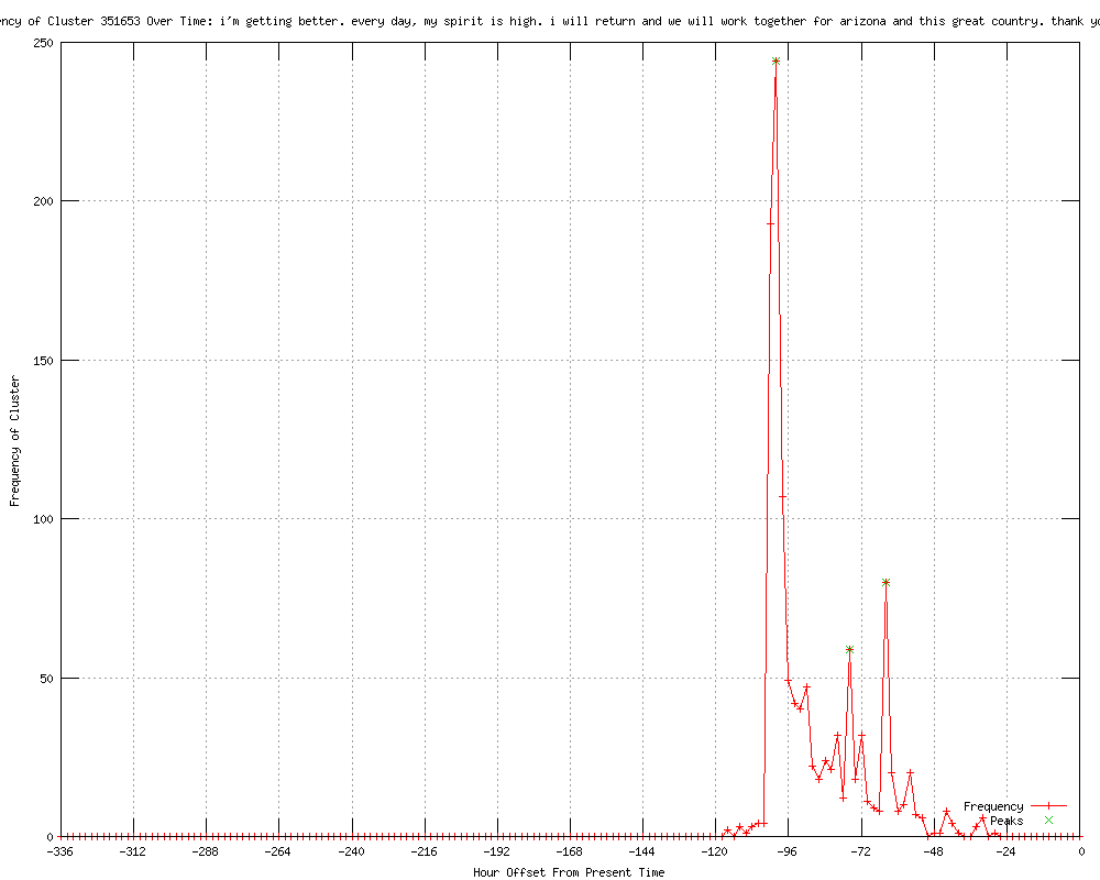 | 99 | i'm getting better. every day my spirit is high. i will return and we will work together for arizona and this great country. thank you very much Urls http://foxnews.com/politics/2012/01/22/giffords-to-resign-from-congress/ http://dailycaller.com/2012/01/22/rep-gabby-giffords-stepping-down-from-congress-%e2%80%98this-week%e2%80%99-video/ http://us.rd.yahoo.com/dailynews/rss/politics/*http://news.yahoo.com/s/dailycaller/20120122/pl_dailycaller/repgabbygiffordssteppingdownfromcongresse28098thisweeke28099video http://reuters.com/article/2012/01/22/us-usa-giffords-resignation-idUSTRE80L0RK20120122?feedType=RSS&feedName=topNews http://ca.reuters.com/article/topNews/idCATRE80L0RK20120122 http://reuters.com/article/2012/01/22/us-usa-giffords-resignation-idUSTRE80L0RK20120122?feedType=RSS&feedName=politicsNews http://feeds.reuters.com/~r/reuters/topNews/~3/ULP0ax8bnTo/us-usa-giffords-resignation-idUSTRE80L0RK20120122 http://reuters.com/article/2012/01/22/us-usa-giffords-resignation-idUSTRE80L0RK20120122?feedType=RSS&feedName=topNews&rpc=22&sp=true http://us.rd.yahoo.com/dailynews/rss/topstories/*http://news.yahoo.com/s/nm/20120122/pl_nm/us_usa_giffords_resignation http://news.yahoo.com/gabrielle-giffords-resigning-focus-recovery-youtube-193454630.html http://wnep.com/news/sns-rt-us-usa-giffords-resignationtre80l0rk-20120122,0,7641352.story http://publicbroadcasting.net/wkyu/news.newsmain/article/0/0/1896538/Top.Stories/Gabrielle.Giffords.resigning.to.focus.on.recovery http://fk.cm/6895367 http://reuters.com/article/2012/01/22/us-usa-giffords-resignation-idUSTRE80L0RK20120122 http://newsdaily.com/stories/tre80l0rk-us-usa-giffords-resignation/ http://feeds.reuters.com/%7Er/Reuters/PoliticsNews/%7E3/z17-9-bARXM/us-usa-giffords-resignation-idUSTRE80L0RK20120122 http://cnews.canoe.ca/CNEWS/World/2012/01/22/19278461.html?cid=rssnews http://ottawasun.com/2012/01/22/giffords-resigning-to-focus-on-recovery http://rocketnews.com/2012/01/gabrielle-giffords-resigning-to-focus-on-recovery/ http://jpost.com/International/Article.aspx?ID=254703&R=R1 http://calgarysun.com/2012/01/22/giffords-resigning-to-focus-on-recovery http://winnipegsun.com/2012/01/22/giffords-resigning-to-focus-on-recovery http://torontosun.com/2012/01/22/giffords-resigning-to-focus-on-recovery http://stuff.co.nz/timaru-herald/world/6299089/Gabrielle-Giffords-steps-down-from-Congress http://edmontonsun.com/2012/01/22/giffords-resigning-to-focus-on-recovery http://stuff.co.nz/world/americas/6299089/Gabrielle-Giffords-steps-down-from-Congress http://kgmi.com/Giffords-leaving-Congress-to-recover-from-shooting/11461903?newsId=123898 http://publicbroadcasting.net/wkyu/news.newsmain/article/0/0/1896554/Top.Stories/Giffords.leaving.Congress.to.recover.from.shooting http://thebarrieexaminer.com/ArticleDisplay.aspx?e=3445115 http://in.reuters.com/video/2012/01/22/us-rep-giffords-resigning-to-focus-on-re?videoId=228936294&feedType=VideoRSS&feedName=LatestVideosIN&videoChannel=117762 http://wsbt.com/news/sns-rt-us-usa-giffords-resignationtre80l0rk-20120122,0,4556468.story http://wsbt.com/sns-rt-us-usa-giffords-resignationtre80l0rk-20120122,0,2263942.story http://wsbt.com/news/sns-rt-us-usa-giffords-resignationtre80l0rk-20120122,0,4556468.story?track=rss http://canberratimes.com.au/news/world/world/general/universally-admired/2429041.aspx?src=rss http://reuters.com/video/2012/01/22/us-rep-giffords-resigning-to-focus-on-re?videoId=228936294&videoChannel=1 http://fox13now.com/sns-rt-us-usa-giffords-resignationtre80l0rk-20120122,0,4412826.story http://myvictoriaonline.com/content_page.php?contentType=4&contentId=9821753&fGId=21522&fGCTId=47&tempId=36264&tId=1&gId=1447 http://wbco.com/content_page.php?contentType=4&contentId=9821753&fGId=21522&fGCTId=47&tempId=46234&tId=1&gId=831 http://wsny.net/content_page.php?contentType=4&contentId=9821753&fGId=21522&fGCTId=47&tempId=26970&tId=1&gId=831 http://reuters.com/article/2012/01/23/us-usa-giffords-resignation-idUSTRE80L0RK20120123?feedType=RSS&feedName=politicsNews http://reuters.com/article/2012/01/23/us-usa-giffords-resignation-idUSTRE80L0RK20120123?feedType=RSS&feedName=topNews http://reuters.com/article/2012/01/23/us-usa-giffords-resignation-idUSTRE80L0RK20120123?feedType=RSS&feedName=topNews&rpc=22&sp=true http://us.rd.yahoo.com/dailynews/rss/topstories/*http://news.yahoo.com/s/nm/20120123/pl_nm/us_usa_giffords_resignation http://news.yahoo.com/giffords-leaving-congress-recover-shooting-001709441.html http://ca.reuters.com/article/topNews/idCATRE80L0RK20120123 http://reuters.com/article/2012/01/23/us-usa-giffords-resignation-idUSTRE80L0RK20120123 http://cnbc.com//id/46094166 http://feeds.reuters.com/~r/reuters/topNews/~3/Fd7fn1Za_0o/us-usa-giffords-resignation-idUSTRE80L0RK20120123 http://feeds.reuters.com/~r/Reuters/PoliticsNews/~3/RMpdtJgmxAk/us-usa-giffords-resignation-idUSTRE80L0RK20120123 http://rocketnews.com/2012/01/giffords-leaving-congress-to-recover-from-shooting/ http://wkzo.com/news/articles/2012/jan/22/giffords-leaving-congress-to-recover-from-shooting/ http://feeds.reuters.com/%7Er/Reuters/PoliticsNews/%7E3/RMpdtJgmxAk/us-usa-giffords-resignation-idUSTRE80L0RK20120123 http://reuters.com/video/2012/01/22/us-rep-giffords-resigning-to-focus-on-re?videoId=228936294&newsChannel=newsOne http://rocketnews.com/2012/01/giffords-leaving-congress-to-recover-from-shooting-2/ http://rocketnews.com/2012/01/giffords-leaving-congress-to-recover-from-shooting-3/ http://zeenews.india.com/news/world/giffords-leaving-congress-to-recover-from-shooting_754313.html http://jpost.com/VideoArticles/Video/Article.aspx?ID=254703&R=R1 http://allnews.rss.themalaysianinsider.com/c/33362/f/567634/s/1c0c092b/l/0L0Sthemalaysianinsider0N0Cworld0Carticle0Cgiffords0Eleaving0Eus0Econgress0Eto0Erecover0Efrom0Eshooting0C/story01.htm http://mf.feeds.reuters.com/c/871/f/605700/s/1c0ae619/l/0Luk0Breuters0N0Cvideo0C20A120C0A10C220Cus0Erep0Egiffords0Eresigning0Eto0Efocus0Eon0Ere0DvideoId0F2289362940GfeedType0FVideoRSS0GfeedName0