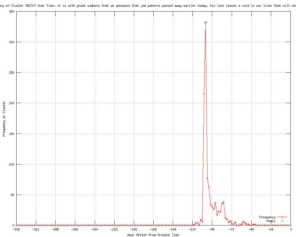| 120 | it is with great sadness that we announce that joe paterno passed away earlier today Urls http://longislandpress.com/2012/01/22/joe-paterno-dead-at-85/ http://massappealnews.com/2012/01/22/joe-paterno-passes-away/ http://fox2now.com/sports/ktla-joe-paterno-cancer,0,3990964.story http://outsidethebeltway.com/joe-paterno-dead-at-85-family-conirms/ http://wik.io/info/US/310762772 http://outsidethebeltway.com/joe-paterno-dead-at-85-family-conirms/?utm_source=feedburner&utm_medium=feed&utm_campaign=Feed%3A+OTB+%28Outside+The+Beltway+%7C+OTB%29 http://tvguide.com/News/Joe-Paterno-Dies-1042113.aspx?rss=breakingnews http://omg.yahoo.com/news/former-penn-state-coach-joe-paterno-dies-160800988.html http://us.rd.yahoo.com/dailynews/rss/entertainment/*http://us.rd.yahoo.com/dailynews/external/omg_rss/rss_omg_en/news_former_penn_state_coach_joe_paterno_dies160800988/44264077/*http://omg.yahoo.com/news/former-penn-state-coach-joe-paterno-dies-160800988.html http://seattlepi.com/ae/tv/tvguide/article/Former-Penn-State-Coach-Joe-Paterno-Dies-2673789.php http://tvguide.com/News/Joe-Paterno-Dies-1042113.aspx?rss=keywords&partnerid=alltop&profileid=celebs http://wdsu.com/sports/30271370/detail.html http://cnn.com/2012/01/22/us/penn-state-paterno/index.html?hpt=hp_c1 http://cnn.com/2012/01/22/us/pennsylvania-obit-paterno/index.html?hpt=hp_t1 http://kbmt12.com/story/16573271/former-penn-state-coach-paterno-dead-at-85 http://edition.cnn.com/2012/01/22/us/pennsylvania-obit-paterno/index.html?eref=edition http://cnn.com/2012/01/22/us/pennsylvania-obit-paterno/index.html?eref=rss_latest http://rss.cnn.com/~r/rss/cnn_topstories/~3/FtdvBZRTBGY/index.html http://wesh.com/news/30272059/detail.html http://cnn.com/2012/01/22/us/pennsylvania-obit-paterno/index.html?eref=rss_topstories http://foxtricities.com/fox-tri-cities/30272059/detail.html http://ktxs.com/news/30272059/detail.html http://ktvz.com/news/30272059/detail.html http://nbcmontana.com/news/30272059/detail.html http://supertalk1570.com/includes/news_items/5/news_items_more.php?id=2371§ion_id=5 http://wsoctv.com/news/30272059/detail.html http://rss.cnn.com/~r/rss/cnn_latest/~3/ALEhSIxNoa0/index.html http://wxii12.com/news/30272059/detail.html http://thoroughlyandersoncooper.blogspot.com/2012/01/partial-end-of-sex-scandal.html http://wdsu.com/news/30272059/detail.html http://foxtricities.com/news/30272059/detail.html http://cnn.com/2012/01/22/us/pennsylvania-obit-paterno/index.html?hpt=hp_c1 http://cnn.com/2012/01/22/us/pennsylvania-obit-paterno/index.html?eref=rss_us http://edition.cnn.com/2012/01/22/us/pennsylvania-obit-paterno/index.html?eref=edition_us http://wibw.com/home/headlines/137848693.html http://edition.cnn.com/2012/01/22/us/pennsylvania-obit-paterno/index.html?eref=rss_us http://krcrtv.com/news/30272059/detail.html http://ozarksfirst.com/fulltext?nxd_id=590372 http://ksbw.com/news/30272059/detail.html http://wlwt.com/news/30272059/detail.html http://talkdelaware.com/general-news/19057-paterno-dies-age-85-a.html http://ladeeninet.blogspot.com/2012/01/opposing-views-issues-experts-answers_23.html http://theroot.com/joe-paterno-dead-at-85 http://privateinvesigations.blogspot.com/2012/01/joe-paterno-former-penn-state-football.html http://wibw.com/home/headlines/Legendary_Penn_State_Coach_Paterno_Dead_At_85_137848693.html http://wnep.com/wnep-paterno-loses-battle-with-cancerbb-20120122,0,2175393.story http://threedonia.com/archives/48290 http://opposingviews.com/i/sports/ncaa-football/big-ten/penn-state%E2%80%99s-joe-paterno-dead-age-85 http://wibw.com/nationalnews/headlines/Legendary_Penn_State_Coach_Paterno_Dead_At_85_137848693.html http://wlos.com/shared/newsroom/top_stories/videos/wlos_vid_6465.shtml?wap=0 http://wnep.com/wnep-paterno-loses-battle-with-cancerbb-20120122,0,2175393.story?track=rss http://justnews.com/news/Legendary-Penn-State-coach-Paterno-dead-at-85/-/1717324/8483116/-/14cdc4bz/-/index.html http://examiner.com/penn-state-nittany-lions-football-in-philadelphia/joe?cid=PROG-TagPage-HomepageHotTopic2-PaternoDeath http://eurweb.com/2012/01/joe-paterno-dead-85-lung-cancer/ http://wcti12.com/news/30272182/detail.html http://scottedwardphelps.blogspot.com/2012/01/on-maestrosand-mortals.html http://feeds.nydailynews.com/%7Er/nydnrss/news/%7E3/u2dsiyd_o9Q/story01.htm http://wibw.com/sports/headlines/Legendary_Penn_State_Coach_Paterno_Dead_At_85_137848693.html http://thelifeofluxury.com/ex-penn-state-football-coach-joe-paterno-has-died-at-age-85/ http://examiner.com/foster-care-adoption-in-national/did-sandusky-send-paterno-to-his-grave http://bilalaliproductions.com/sports-news/penn-state-coach-paterno-dead-at-85/ http://blackchristiannews.com/news/2012/01/joe-paterno-the-winningest-coach-in-major-college-football-dead-at-85.html http://wjhg.com/home/headlines/Joe_Paterno_Dies_Sunday_Morning__137848828.html http://ushotbuzz.blogspot.com/2012/01/joe-paterno-1926-2012-msnbccom.html http://au.news.yahoo.com/a/-/world/12688853/legendary-us-college-football-coach-joe-paterno-dies/ http://au.news.yahoo.com/a/-/business/12688853/legendary-us-college-football-coach-joe-paterno-dies/ http://kwtx.com/home/headlines/Ex-Penn_State_coach_Joe_Paterno_dead_at_85_137849373.html http://kwtx.com/_254sports/headlines/Ex-Penn_State_coach_Joe_Paterno_dead_at_85_137849373.html http://kwtx.com/nationalnews/headlines/Ex-Penn_State_coach_Joe_Paterno_dead_at_85_137849373.html http://au.news.yahoo.com/world/a/-/world/12688853/legendary-us-college-football-coach-joe-paterno-dies/ http://france24.com/en/20120122-legendary-us-college-football-coach-joe-paterno-dies http://france24.com/en/20120122-legendary-us-college-football-coach-joe-paterno-dies-0 http://blog.chron.com/jeromesolomon/2012/01/joe-paterno-the-passing-of-a-legend/ http://mercurynews.com/college-sports/ci_19794903?source=rss http://channelnewsasia.com/stories/afp_sports/view/1178423/1/.html http://mouthtoears.blogspot.com/2012/01/rip-joe-paterno.html http://atrl.net/forums/showthread.php?t=17797