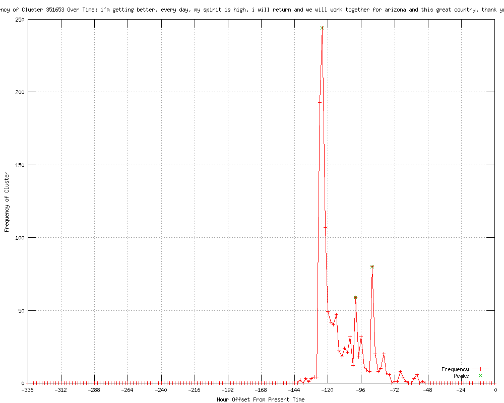 | 99 | i'm getting better. every day my spirit is high. i will return and we will work together for arizona and this great country. thank you very much Urls http://foxnews.com/politics/2012/01/22/giffords-to-resign-from-congress/ http://dailycaller.com/2012/01/22/rep-gabby-giffords-stepping-down-from-congress-%e2%80%98this-week%e2%80%99-video/ http://us.rd.yahoo.com/dailynews/rss/politics/*http://news.yahoo.com/s/dailycaller/20120122/pl_dailycaller/repgabbygiffordssteppingdownfromcongresse28098thisweeke28099video http://reuters.com/article/2012/01/22/us-usa-giffords-resignation-idUSTRE80L0RK20120122?feedType=RSS&feedName=topNews http://ca.reuters.com/article/topNews/idCATRE80L0RK20120122 http://reuters.com/article/2012/01/22/us-usa-giffords-resignation-idUSTRE80L0RK20120122?feedType=RSS&feedName=politicsNews http://feeds.reuters.com/~r/reuters/topNews/~3/ULP0ax8bnTo/us-usa-giffords-resignation-idUSTRE80L0RK20120122 http://reuters.com/article/2012/01/22/us-usa-giffords-resignation-idUSTRE80L0RK20120122?feedType=RSS&feedName=topNews&rpc=22&sp=true http://us.rd.yahoo.com/dailynews/rss/topstories/*http://news.yahoo.com/s/nm/20120122/pl_nm/us_usa_giffords_resignation http://news.yahoo.com/gabrielle-giffords-resigning-focus-recovery-youtube-193454630.html http://wnep.com/news/sns-rt-us-usa-giffords-resignationtre80l0rk-20120122,0,7641352.story http://publicbroadcasting.net/wkyu/news.newsmain/article/0/0/1896538/Top.Stories/Gabrielle.Giffords.resigning.to.focus.on.recovery http://fk.cm/6895367 http://reuters.com/article/2012/01/22/us-usa-giffords-resignation-idUSTRE80L0RK20120122 http://newsdaily.com/stories/tre80l0rk-us-usa-giffords-resignation/ http://feeds.reuters.com/%7Er/Reuters/PoliticsNews/%7E3/z17-9-bARXM/us-usa-giffords-resignation-idUSTRE80L0RK20120122 http://cnews.canoe.ca/CNEWS/World/2012/01/22/19278461.html?cid=rssnews http://ottawasun.com/2012/01/22/giffords-resigning-to-focus-on-recovery http://rocketnews.com/2012/01/gabrielle-giffords-resigning-to-focus-on-recovery/ http://jpost.com/International/Article.aspx?ID=254703&R=R1 http://calgarysun.com/2012/01/22/giffords-resigning-to-focus-on-recovery http://winnipegsun.com/2012/01/22/giffords-resigning-to-focus-on-recovery http://torontosun.com/2012/01/22/giffords-resigning-to-focus-on-recovery http://stuff.co.nz/timaru-herald/world/6299089/Gabrielle-Giffords-steps-down-from-Congress http://edmontonsun.com/2012/01/22/giffords-resigning-to-focus-on-recovery http://stuff.co.nz/world/americas/6299089/Gabrielle-Giffords-steps-down-from-Congress http://kgmi.com/Giffords-leaving-Congress-to-recover-from-shooting/11461903?newsId=123898 http://publicbroadcasting.net/wkyu/news.newsmain/article/0/0/1896554/Top.Stories/Giffords.leaving.Congress.to.recover.from.shooting http://thebarrieexaminer.com/ArticleDisplay.aspx?e=3445115 http://in.reuters.com/video/2012/01/22/us-rep-giffords-resigning-to-focus-on-re?videoId=228936294&feedType=VideoRSS&feedName=LatestVideosIN&videoChannel=117762 http://wsbt.com/news/sns-rt-us-usa-giffords-resignationtre80l0rk-20120122,0,4556468.story http://wsbt.com/sns-rt-us-usa-giffords-resignationtre80l0rk-20120122,0,2263942.story http://wsbt.com/news/sns-rt-us-usa-giffords-resignationtre80l0rk-20120122,0,4556468.story?track=rss http://canberratimes.com.au/news/world/world/general/universally-admired/2429041.aspx?src=rss http://reuters.com/video/2012/01/22/us-rep-giffords-resigning-to-focus-on-re?videoId=228936294&videoChannel=1 http://fox13now.com/sns-rt-us-usa-giffords-resignationtre80l0rk-20120122,0,4412826.story http://myvictoriaonline.com/content_page.php?contentType=4&contentId=9821753&fGId=21522&fGCTId=47&tempId=36264&tId=1&gId=1447 http://wbco.com/content_page.php?contentType=4&contentId=9821753&fGId=21522&fGCTId=47&tempId=46234&tId=1&gId=831 http://wsny.net/content_page.php?contentType=4&contentId=9821753&fGId=21522&fGCTId=47&tempId=26970&tId=1&gId=831 http://reuters.com/article/2012/01/23/us-usa-giffords-resignation-idUSTRE80L0RK20120123?feedType=RSS&feedName=politicsNews http://reuters.com/article/2012/01/23/us-usa-giffords-resignation-idUSTRE80L0RK20120123?feedType=RSS&feedName=topNews http://reuters.com/article/2012/01/23/us-usa-giffords-resignation-idUSTRE80L0RK20120123?feedType=RSS&feedName=topNews&rpc=22&sp=true http://us.rd.yahoo.com/dailynews/rss/topstories/*http://news.yahoo.com/s/nm/20120123/pl_nm/us_usa_giffords_resignation http://news.yahoo.com/giffords-leaving-congress-recover-shooting-001709441.html http://ca.reuters.com/article/topNews/idCATRE80L0RK20120123 http://reuters.com/article/2012/01/23/us-usa-giffords-resignation-idUSTRE80L0RK20120123 http://cnbc.com//id/46094166 http://feeds.reuters.com/~r/reuters/topNews/~3/Fd7fn1Za_0o/us-usa-giffords-resignation-idUSTRE80L0RK20120123 http://feeds.reuters.com/~r/Reuters/PoliticsNews/~3/RMpdtJgmxAk/us-usa-giffords-resignation-idUSTRE80L0RK20120123 http://rocketnews.com/2012/01/giffords-leaving-congress-to-recover-from-shooting/ http://wkzo.com/news/articles/2012/jan/22/giffords-leaving-congress-to-recover-from-shooting/ http://feeds.reuters.com/%7Er/Reuters/PoliticsNews/%7E3/RMpdtJgmxAk/us-usa-giffords-resignation-idUSTRE80L0RK20120123 http://reuters.com/video/2012/01/22/us-rep-giffords-resigning-to-focus-on-re?videoId=228936294&newsChannel=newsOne http://rocketnews.com/2012/01/giffords-leaving-congress-to-recover-from-shooting-2/ http://rocketnews.com/2012/01/giffords-leaving-congress-to-recover-from-shooting-3/ http://zeenews.india.com/news/world/giffords-leaving-congress-to-recover-from-shooting_754313.html http://jpost.com/VideoArticles/Video/Article.aspx?ID=254703&R=R1 http://allnews.rss.themalaysianinsider.com/c/33362/f/567634/s/1c0c092b/l/0L0Sthemalaysianinsider0N0Cworld0Carticle0Cgiffords0Eleaving0Eus0Econgress0Eto0Erecover0Efrom0Eshooting0C/story01.htm http://mf.feeds.reuters.com/c/871/f/605700/s/1c0ae619/l/0Luk0Breuters0N0Cvideo0C20A120C0A10C220Cus0Erep0Egiffords0Eresigning0Eto0Efocus0Eon0Ere0DvideoId0F2289362940GfeedType0FVideoRSS0GfeedName0