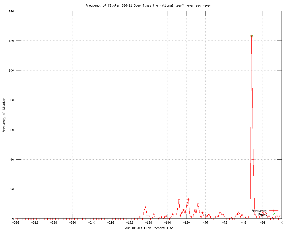 | 7 | the national team? never say never Urls http://goal.com/en/news/2898/euro-2012/2012/01/23/2862713/romas-francesco-totti-open-to-italy-return-for-euro-2012 http://ca.rd.yahoo.com/sports/rss/sow/SIG=12dhgon8q/*http%3A//ca.sports.yahoo.com/sow/news?slug=goal-romasfrancescotottiopentoit http://uk.news.yahoo.com/romas-francesco-totti-open-italy-211800417--soccer.html http://us.rd.yahoo.com/sports/rss/sow/SIG=12a9kudi0/*http%3A//sports.yahoo.com/sow/news?slug=goal-romasfrancescotottiopentoit http://soccerway.com/news/2012/January/24/totti-considers-italy-return http://soccernews.com/totti-considers-italy-return/87325/ http://foreign.peacefmonline.com/sports/201201/90555.php |