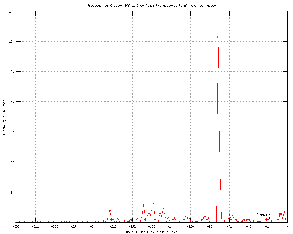 | 7 | the national team? never say never Urls http://goal.com/en/news/2898/euro-2012/2012/01/23/2862713/romas-francesco-totti-open-to-italy-return-for-euro-2012 http://ca.rd.yahoo.com/sports/rss/sow/SIG=12dhgon8q/*http%3A//ca.sports.yahoo.com/sow/news?slug=goal-romasfrancescotottiopentoit http://uk.news.yahoo.com/romas-francesco-totti-open-italy-211800417--soccer.html http://us.rd.yahoo.com/sports/rss/sow/SIG=12a9kudi0/*http%3A//sports.yahoo.com/sow/news?slug=goal-romasfrancescotottiopentoit http://soccerway.com/news/2012/January/24/totti-considers-italy-return http://soccernews.com/totti-considers-italy-return/87325/ http://foreign.peacefmonline.com/sports/201201/90555.php |