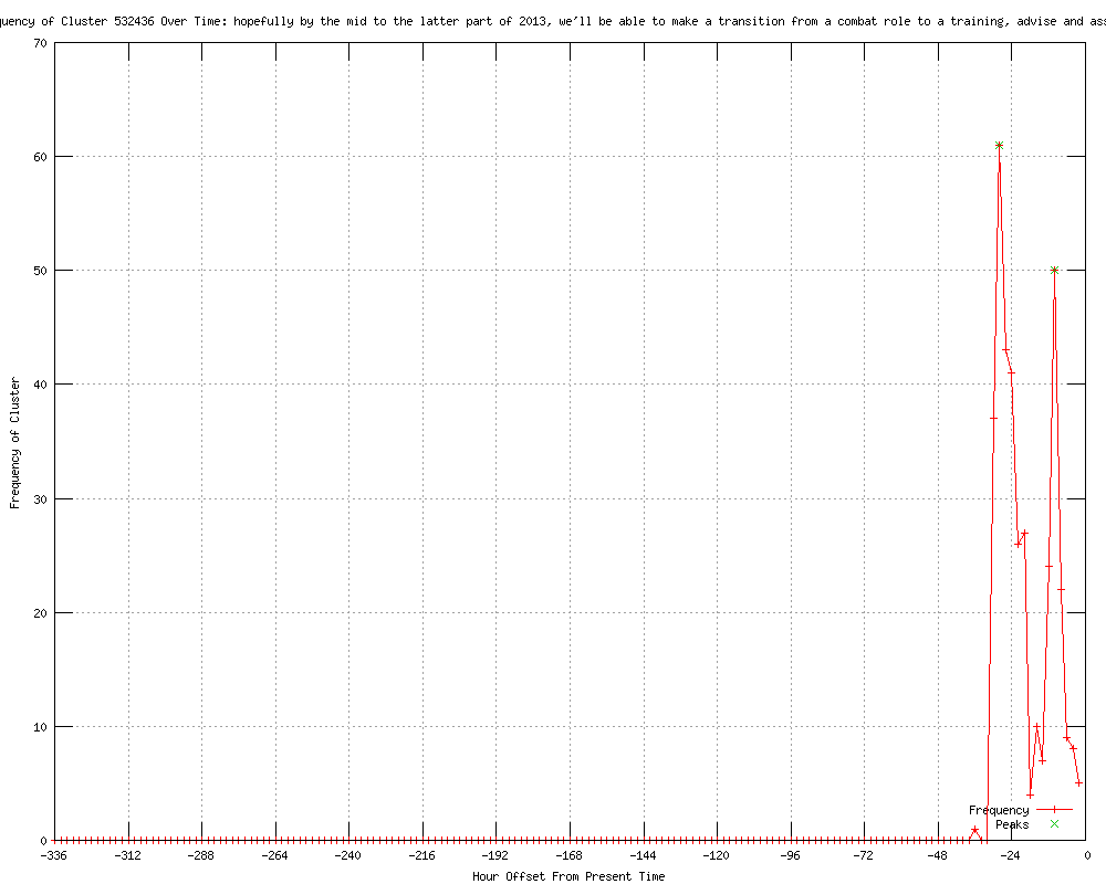 | 15 | hopefully, by mid- to the latter part of 2013, we'll be able to make...a transition from a combat role to a training, advice and assist role Urls http://wapi1070.com/rssItem.asp?feedid=113&itemid=29793802 http://wgowam.com/rssItem.asp?feedid=113&itemid=29793802 http://wjimam.com/rssItem.asp?feedid=113&itemid=29793802 http://wbap.com/rssItem.asp?feedid=113&itemid=29793802 http://ksfo560.com/rssItem.asp?feedid=113&itemid=29793802 http://wjr.net/rssItem.asp?feedid=113&itemid=29793802 http://wbsm.com/rssItem.asp?feedid=113&itemid=29793802 http://wlsam.com/Article.asp?id=2386309&spid= http://wbsm.com/rssItem.asp?feedid=113&itemid=29794287 http://wapi1070.com/rssItem.asp?feedid=113&itemid=29794287 http://wgowam.com/rssItem.asp?feedid=113&itemid=29794287 http://wbap.com/rssItem.asp?feedid=113&itemid=29794287 http://wjimam.com/rssItem.asp?feedid=113&itemid=29794287 http://wjr.net/rssItem.asp?feedid=113&itemid=29794287 http://ksfo560.com/rssItem.asp?feedid=113&itemid=29794287 |