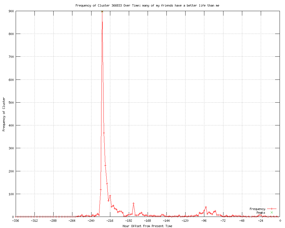 | 6 | many of my friends have a better life than me Urls http://shinyshiny.tv/2012/01/facebook_is_social_media_envy_making_you_sad.html http://thesocietypages.org/citings/2012/01/23/sad-face/ http://vickiw80.blogspot.com/2012/01/finally-someone-did-studyso-true.html http://theaustintimes.com/2012/01/facebook-could-be-a-source-of-depression/ http://emirates247.com/business/facebook-fever-happy-status-update-sad-reality-2012-01-24-1.439115 http://digitaltrends.com/social-media/study-why-facebook-is-making-people-sad/ |
