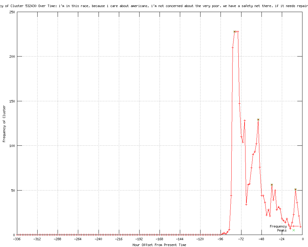 | 4 | i'm in this race because i care about americans. i'm not concerned about the very poor. we have a safety net there Urls http://splendoroftruth.com/curtjester/2012/02/channeling-scrooge/ http://freerepublic.com/focus/f-news/2841047/posts http://punditandpundette.com/2012/02/mr-electable-hones-his-message-im-not.html http://takeastandagainstliberals.blogspot.com/2012/02/mitt-romney-couldnt-care-less.html |