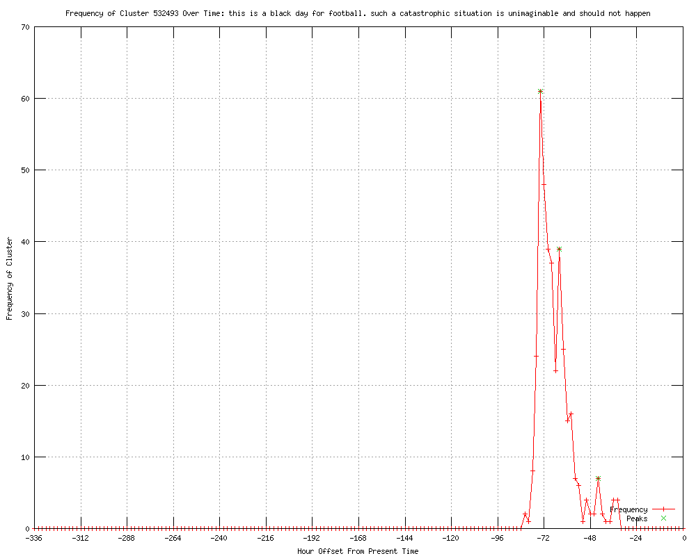 | 21 | this is a black day for football Urls http://rss.cnn.com/~r/rss/cnn_latest/~3/D-3jtfX75fU/index.html http://cnn.com/2012/02/01/world/africa/egypt-soccer-deaths/index.html http://news.chauthiduniya.com/egypt-riot-after-football-match-73-dead http://allnews.rss.themalaysianinsider.com/c/33362/f/567634/s/1c54c9c0/l/0L0Sthemalaysianinsider0N0Csports0Carticle0Cegypt0Earmy0Eruler0Evows0Eto0Efind0Efootball0Eviolence0Eculprits0C/story01.htm http://investmentwatchblog.com/at-least-70-killed-in-egypt-soccer-riot/ http://aljazeera.com/news/middleeast/2012/02/201221231925902989.html http://aljazeera.com//news/middleeast/2012/02/201221231925902989.html http://globalindigo.com/troops-out-after-deadly-egypt-football-clash http://indonesiamedia.com/2012/02/02/many-dead-in-egyptian-football-riot-video/ http://uk.news.yahoo.com/troops-deadly-egypt-football-clash-233805219.html http://globalindigo.com/many-dead-in-egyptian-football-riot http://tahasin13.blogspot.com/2012/02/troops-out-after-deadly-egypt-football.html http://businessweek.com/news/2012-02-02/egypt-soccer-game-riot-kills-more-than-70-hundreds-injured.html http://businessweek.com/news/2012-02-02/egypt-lawmakers-hold-emergency-session-after-deadly-soccer-riot.html http://businessweek.com/news/2012-02-02/egypt-lawmakers-hold-emergency-session-after-soccer-riot.html http://english.alarabiya.net/articles/2012/02/02/192159.html http://businessweek.com/news/2012-02-02/egypt-lawmakers-criticize-police-after-deadly-soccer-riot.html http://voiceofthecopts.org/news/egypts-lawmakers-hold-emergency-session-after-riot-police-fire-tear-gas-at-protesters/ http://businessweek.com/news/2012-02-03/egypt-lawmakers-criticize-police-after-deadly-soccer-riot.html http://blog.cypee.com/2012/02/73-dead-in-riot-after-football-match-in.html http://phuketgazette.net/archives/articles/2012/article12196.html |
