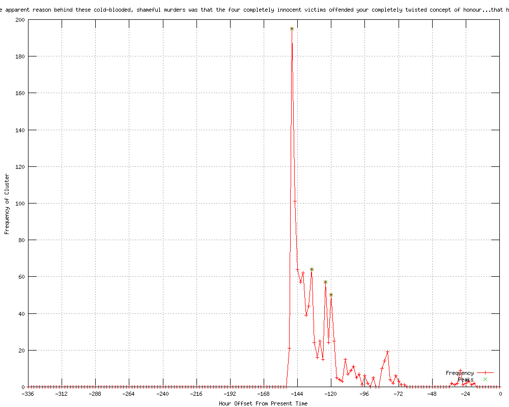 | 22 | the apparent reason behind these cold-blooded, shameful murders was that the four completely innocent victims offended your completely twisted concept of honour Urls http://iol.co.za/news/world/trio-jailed-for-honour-killings-1.1222656 http://uk.news.yahoo.com/three-canadians-jailed-life-honour-killings-062039144.html http://uk.reuters.com/article/2012/01/30/uk-crime-honor-idUKTRE80T08M20120130?feedType=RSS&feedName=worldNews http://af.reuters.com/article/worldNews/idAFTRE80T08M20120130 http://au.news.yahoo.com/a/-/world/12763534/three-canadians-jailed-for-life-for-honour-killings/ http://af.reuters.com/article/worldNews/idAFTRE80T08M20120130?feedType=RSS&feedName=worldNews http://thestar.com.my.feedsportal.com/c/33048/f/534559/s/1c3de664/l/0Lthestar0N0Bmy0Cnews0Cstory0Basp0Dfile0F0C20A120C10C30A0Cworldupdates0C20A120E0A10E30AT0A620A39Z0I10ITRE80AT0A8M0IRTROPTT0I0A0IUK0ECRIME0EHONOR0Gsec0FWorldupdates/story01.htm http://njtamil.com/2012/01/30/three-canadians-jailed-for-life-for-honour-killings/ http://au.news.yahoo.com/a/-/business/12763534/three-canadians-jailed-for-life-for-honour-killings/ http://au.news.yahoo.com/world/a/-/world/12763534/three-canadians-jailed-for-life-for-honour-killings/ http://news.theage.com.au/breaking-news-world/afghans-jailed-for-canada-honour-killing-20120130-1qoi1.html http://news.smh.com.au/breaking-news-world/afghans-jailed-for-canada-honour-killing-20120130-1qoi1.html http://au.news.yahoo.com/a/-/business/12756281/afghans-jailed-for-canada-honour-killing/ http://au.news.yahoo.com/a/-/world/12756281/afghans-jailed-for-canada-honour-killing/ http://au.news.yahoo.com/world/a/-/world/12756281/afghans-jailed-for-canada-honour-killing/ http://uk.reuters.com/article/2012/01/30/uk-crime-honor-idUKTRE80T08M20120130?feedType=RSS&feedName=topNews http://todayonline.com/World/EDC120130-0000138/Three-Canadians-jailed-for-life-for-honour-killings http://thisdaylive.com/articles/three-canadians-jailed-for-life-for-honour-killings-/108172/ http://allnews.rss.themalaysianinsider.com/c/33362/f/567634/s/1c3ec875/l/0L0Sthemalaysianinsider0N0Cworld0Carticle0Cthree0Ecanadians0Ejailed0Efor0Elife0Efor0Ehonour0Ekillings0C/story01.htm http://feeds.reuters.com/%7Er/Reuters/UKTopNews/%7E3/r1UTpdhNUB8/uk-crime-honor-idUKTRE80T08M20120130 http://thestar.com.my.feedsportal.com/c/33048/f/534559/s/1c3e865a/l/0Lthestar0N0Bmy0Cnews0Cstory0Basp0Dfile0F0C20A120C10C30A0Cworldupdates0C20A120E0A10E30AT0A75629Z0I40ITRE80AT0A8M0IRTROPTT0I0A0IUK0ECRIME0EHONOR0Gsec0FWorldupdates/story01.htm http://cyprus-mail.com/canada/three-canadians-jailed-life-honour-killings/20120130 |