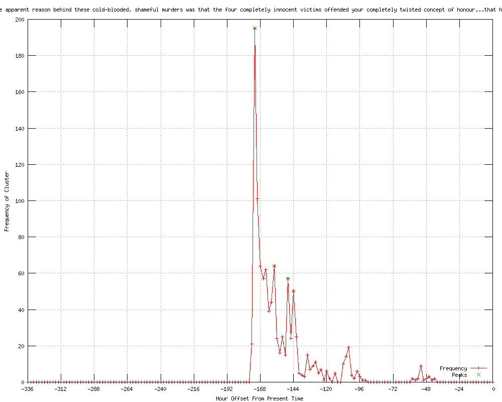 | 22 | the apparent reason behind these cold-blooded, shameful murders was that the four completely innocent victims offended your completely twisted concept of honour Urls http://iol.co.za/news/world/trio-jailed-for-honour-killings-1.1222656 http://uk.news.yahoo.com/three-canadians-jailed-life-honour-killings-062039144.html http://uk.reuters.com/article/2012/01/30/uk-crime-honor-idUKTRE80T08M20120130?feedType=RSS&feedName=worldNews http://af.reuters.com/article/worldNews/idAFTRE80T08M20120130 http://au.news.yahoo.com/a/-/world/12763534/three-canadians-jailed-for-life-for-honour-killings/ http://af.reuters.com/article/worldNews/idAFTRE80T08M20120130?feedType=RSS&feedName=worldNews http://thestar.com.my.feedsportal.com/c/33048/f/534559/s/1c3de664/l/0Lthestar0N0Bmy0Cnews0Cstory0Basp0Dfile0F0C20A120C10C30A0Cworldupdates0C20A120E0A10E30AT0A620A39Z0I10ITRE80AT0A8M0IRTROPTT0I0A0IUK0ECRIME0EHONOR0Gsec0FWorldupdates/story01.htm http://njtamil.com/2012/01/30/three-canadians-jailed-for-life-for-honour-killings/ http://au.news.yahoo.com/a/-/business/12763534/three-canadians-jailed-for-life-for-honour-killings/ http://au.news.yahoo.com/world/a/-/world/12763534/three-canadians-jailed-for-life-for-honour-killings/ http://news.theage.com.au/breaking-news-world/afghans-jailed-for-canada-honour-killing-20120130-1qoi1.html http://news.smh.com.au/breaking-news-world/afghans-jailed-for-canada-honour-killing-20120130-1qoi1.html http://au.news.yahoo.com/a/-/business/12756281/afghans-jailed-for-canada-honour-killing/ http://au.news.yahoo.com/a/-/world/12756281/afghans-jailed-for-canada-honour-killing/ http://au.news.yahoo.com/world/a/-/world/12756281/afghans-jailed-for-canada-honour-killing/ http://uk.reuters.com/article/2012/01/30/uk-crime-honor-idUKTRE80T08M20120130?feedType=RSS&feedName=topNews http://todayonline.com/World/EDC120130-0000138/Three-Canadians-jailed-for-life-for-honour-killings http://thisdaylive.com/articles/three-canadians-jailed-for-life-for-honour-killings-/108172/ http://allnews.rss.themalaysianinsider.com/c/33362/f/567634/s/1c3ec875/l/0L0Sthemalaysianinsider0N0Cworld0Carticle0Cthree0Ecanadians0Ejailed0Efor0Elife0Efor0Ehonour0Ekillings0C/story01.htm http://feeds.reuters.com/%7Er/Reuters/UKTopNews/%7E3/r1UTpdhNUB8/uk-crime-honor-idUKTRE80T08M20120130 http://thestar.com.my.feedsportal.com/c/33048/f/534559/s/1c3e865a/l/0Lthestar0N0Bmy0Cnews0Cstory0Basp0Dfile0F0C20A120C10C30A0Cworldupdates0C20A120E0A10E30AT0A75629Z0I40ITRE80AT0A8M0IRTROPTT0I0A0IUK0ECRIME0EHONOR0Gsec0FWorldupdates/story01.htm http://cyprus-mail.com/canada/three-canadians-jailed-life-honour-killings/20120130 |