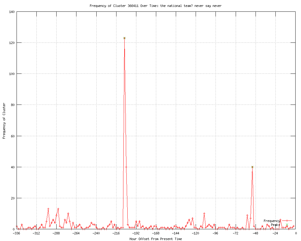 | 7 | the national team? never say never Urls http://goal.com/en/news/2898/euro-2012/2012/01/23/2862713/romas-francesco-totti-open-to-italy-return-for-euro-2012 http://ca.rd.yahoo.com/sports/rss/sow/SIG=12dhgon8q/*http%3A//ca.sports.yahoo.com/sow/news?slug=goal-romasfrancescotottiopentoit http://uk.news.yahoo.com/romas-francesco-totti-open-italy-211800417--soccer.html http://us.rd.yahoo.com/sports/rss/sow/SIG=12a9kudi0/*http%3A//sports.yahoo.com/sow/news?slug=goal-romasfrancescotottiopentoit http://soccerway.com/news/2012/January/24/totti-considers-italy-return http://soccernews.com/totti-considers-italy-return/87325/ http://foreign.peacefmonline.com/sports/201201/90555.php |