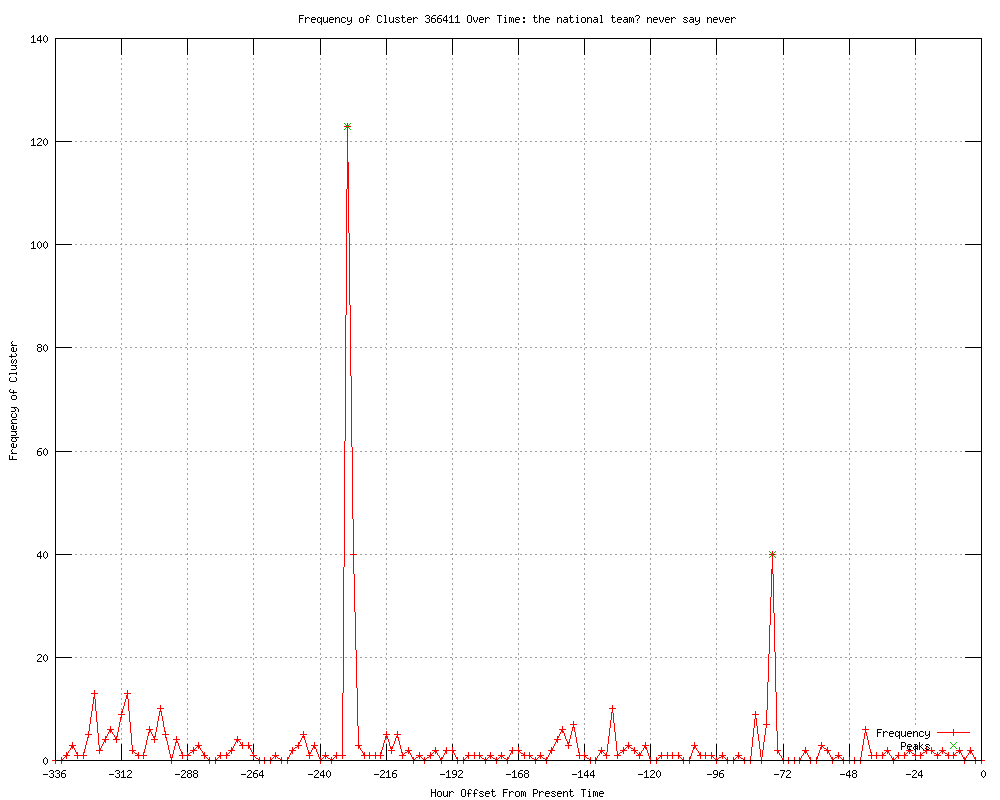 | 7 | the national team? never say never Urls http://goal.com/en/news/2898/euro-2012/2012/01/23/2862713/romas-francesco-totti-open-to-italy-return-for-euro-2012 http://ca.rd.yahoo.com/sports/rss/sow/SIG=12dhgon8q/*http%3A//ca.sports.yahoo.com/sow/news?slug=goal-romasfrancescotottiopentoit http://uk.news.yahoo.com/romas-francesco-totti-open-italy-211800417--soccer.html http://us.rd.yahoo.com/sports/rss/sow/SIG=12a9kudi0/*http%3A//sports.yahoo.com/sow/news?slug=goal-romasfrancescotottiopentoit http://soccerway.com/news/2012/January/24/totti-considers-italy-return http://soccernews.com/totti-considers-italy-return/87325/ http://foreign.peacefmonline.com/sports/201201/90555.php |