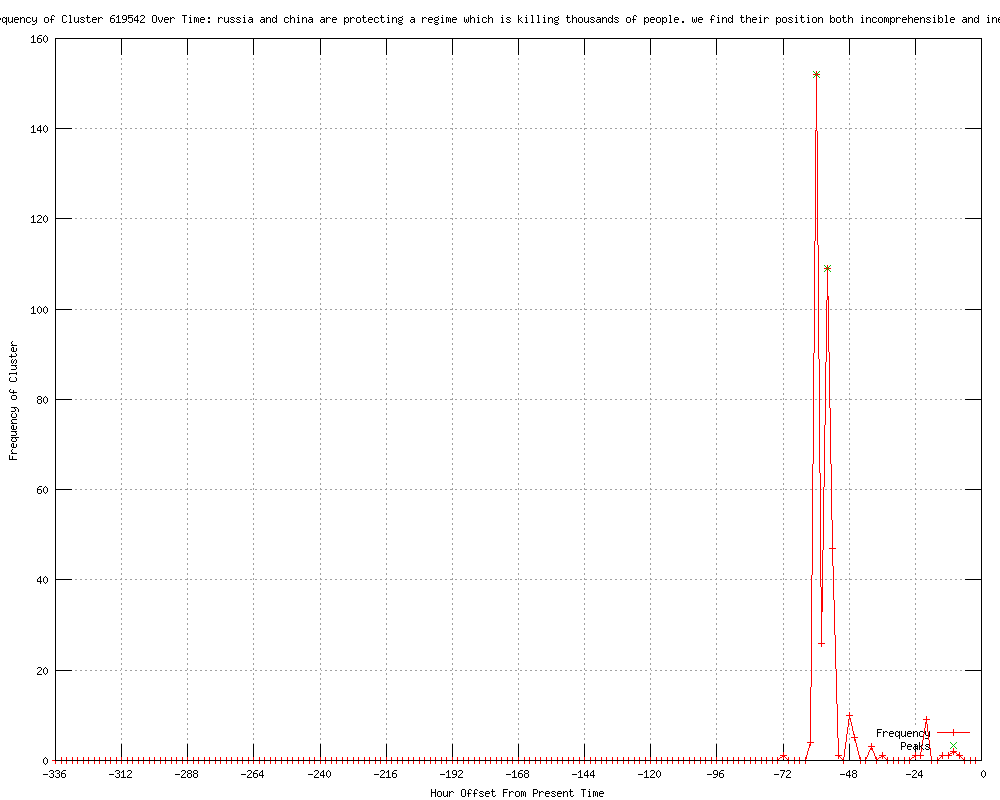 | 12 | russia and china are protecting a regime that is killing thousands of people. we find their position incomprehensible and inexcusable Urls http://telegraph.feedsportal.com/c/32726/f/564430/s/1c70244b/l/0L0Stelegraph0O0Cnews0Cworldnews0Cmiddleeast0C90A641780CUS0Ecloses0Eembassy0Ein0ESyria0Eas0Ediplomatic0Epressure0Emounts0Eon0EAssad0Bhtml/story01.htm http://telegraph.co.uk/news/worldnews/middleeast/9064178/US-closes-embassy-in-Syria-as-diplomatic-pressure-mounts-on-Assad.html http://nguyenhoaitrang.blogspot.com/2012/02/world-us-closes-embassy-in-syria-as.html http://au.news.yahoo.com/a/-/business/12826031/syrian-forces-bombard-protest-hubs/ http://au.news.yahoo.com/a/-/world/12826031/syrian-forces-bombard-protest-hubs/ http://au.news.yahoo.com/world/a/-/world/12826031/syrian-forces-bombard-protest-hubs/ http://au.news.yahoo.com/world/a/-/world/12826031/syria-pounds-protest-hubs-as-nearly-50-killed/ http://au.news.yahoo.com/a/-/business/12826031/syria-pounds-protest-hubs-as-nearly-50-killed/ http://au.news.yahoo.com/a/-/world/12826031/syria-pounds-protest-hubs-as-nearly-50-killed/ http://en.apa.az/news.php?id=165143 http://uk.news.yahoo.com/britain-seeks-un-eu-pressure-syria-134840494.html http://nineoclock.ro/army-steps-up-homs-shelling-more-reported-killed/ |