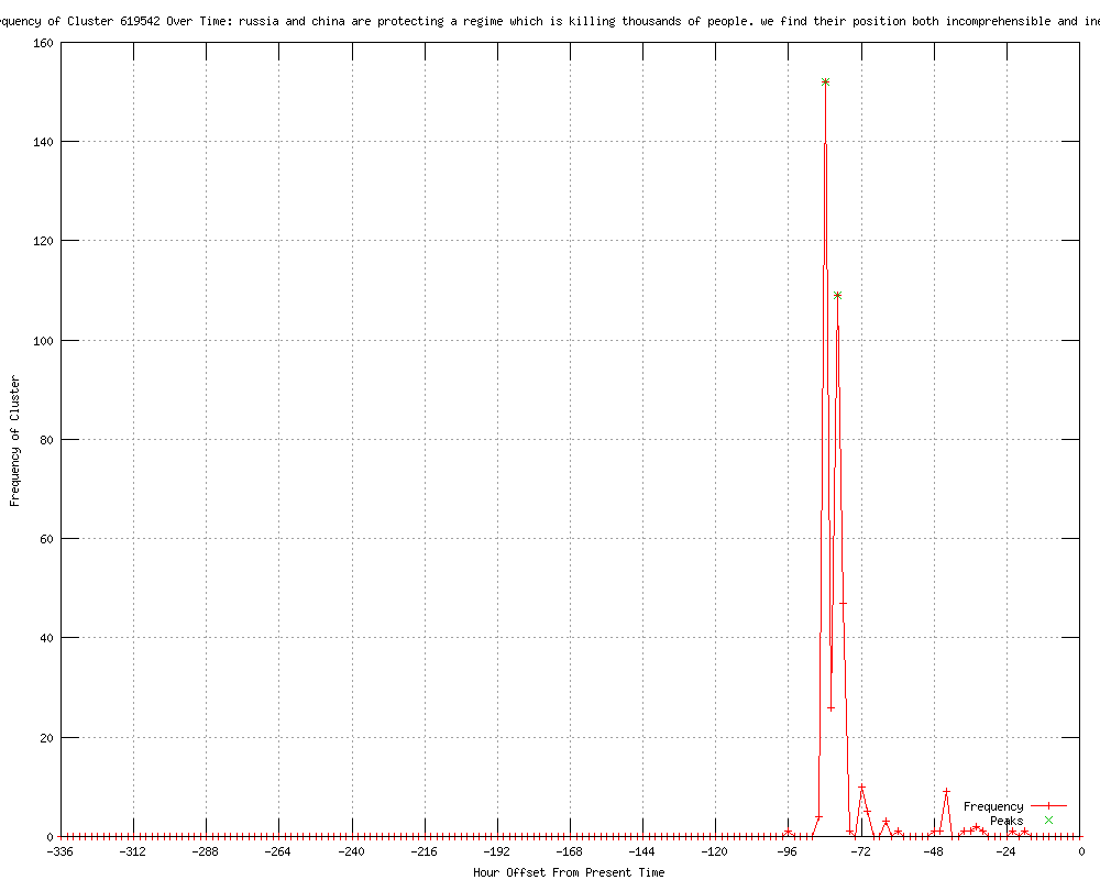 | 12 | russia and china are protecting a regime that is killing thousands of people. we find their position incomprehensible and inexcusable Urls http://telegraph.feedsportal.com/c/32726/f/564430/s/1c70244b/l/0L0Stelegraph0O0Cnews0Cworldnews0Cmiddleeast0C90A641780CUS0Ecloses0Eembassy0Ein0ESyria0Eas0Ediplomatic0Epressure0Emounts0Eon0EAssad0Bhtml/story01.htm http://telegraph.co.uk/news/worldnews/middleeast/9064178/US-closes-embassy-in-Syria-as-diplomatic-pressure-mounts-on-Assad.html http://nguyenhoaitrang.blogspot.com/2012/02/world-us-closes-embassy-in-syria-as.html http://au.news.yahoo.com/a/-/business/12826031/syrian-forces-bombard-protest-hubs/ http://au.news.yahoo.com/a/-/world/12826031/syrian-forces-bombard-protest-hubs/ http://au.news.yahoo.com/world/a/-/world/12826031/syrian-forces-bombard-protest-hubs/ http://au.news.yahoo.com/world/a/-/world/12826031/syria-pounds-protest-hubs-as-nearly-50-killed/ http://au.news.yahoo.com/a/-/business/12826031/syria-pounds-protest-hubs-as-nearly-50-killed/ http://au.news.yahoo.com/a/-/world/12826031/syria-pounds-protest-hubs-as-nearly-50-killed/ http://en.apa.az/news.php?id=165143 http://uk.news.yahoo.com/britain-seeks-un-eu-pressure-syria-134840494.html http://nineoclock.ro/army-steps-up-homs-shelling-more-reported-killed/ |