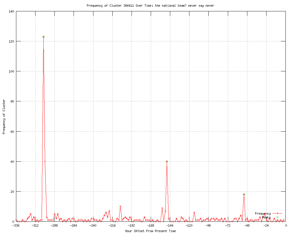 | 7 | the national team? never say never Urls http://goal.com/en/news/2898/euro-2012/2012/01/23/2862713/romas-francesco-totti-open-to-italy-return-for-euro-2012 http://ca.rd.yahoo.com/sports/rss/sow/SIG=12dhgon8q/*http%3A//ca.sports.yahoo.com/sow/news?slug=goal-romasfrancescotottiopentoit http://uk.news.yahoo.com/romas-francesco-totti-open-italy-211800417--soccer.html http://us.rd.yahoo.com/sports/rss/sow/SIG=12a9kudi0/*http%3A//sports.yahoo.com/sow/news?slug=goal-romasfrancescotottiopentoit http://soccerway.com/news/2012/January/24/totti-considers-italy-return http://soccernews.com/totti-considers-italy-return/87325/ http://foreign.peacefmonline.com/sports/201201/90555.php |