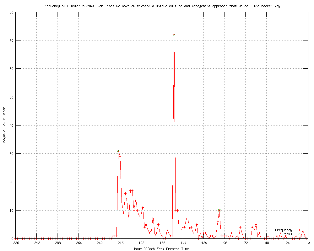 | 15 | we have cultivated a unique culture and management approach that we call the hacker way Urls http://rss.cnn.com/~r/rss/money_technology/~3/5ISRpu_o-NA/index.htm http://money.cnn.com/rssclick/2012/02/01/technology/facebook_hacker_way/index.htm?section=money_technology http://us.rd.yahoo.com/finance/external/cnnm/rss/SIG=12aqkv1jp/*http://money.cnn.com/2012/02/01/technology/facebook_hacker_way/index.htm?source=yahoo_quote http://money.cnn.com/2012/02/01/technology/facebook_hacker_way/index.htm http://money.cnn.com/rssclick/2012/02/01/technology/facebook_hacker_way/index.htm?section=money_news_companies http://cnn.com/2012/02/02/world/advisory-cnn-wire-outlook/index.html?eref=rss_latest http://wibw.com/home/headlines/Facebook_IPO_highlights_The_Hacker_Way__138558369.html http://wibw.com/nationalnews/headlines/Facebook-Hacker-Way_138575474.html http://prospect.org/article/facebook-bares-its-soul http://leftword.blogdig.net/archives/articles/February2012/02/Facebook_Bares_Its_Soul.html http://siliconrepublic.com/business/item/25600-zuckerberg-tells-potential http://usatoday.com/tech/news/story/2012-02-02/facebook-ipo-risks/52940112/1?csp=34tech http://usatoday.com/tech/news/story/2012-02-02/facebook-ipo-risks/52940112/1?csp=34money http://rssfeeds.usatoday.com/%7Er/UsatodaycomMoney-TopStories/%7E3/SH1fp93jsZI/1 http://blog.cypee.com/2012/02/facebook-files-for-historic-ipo.html |