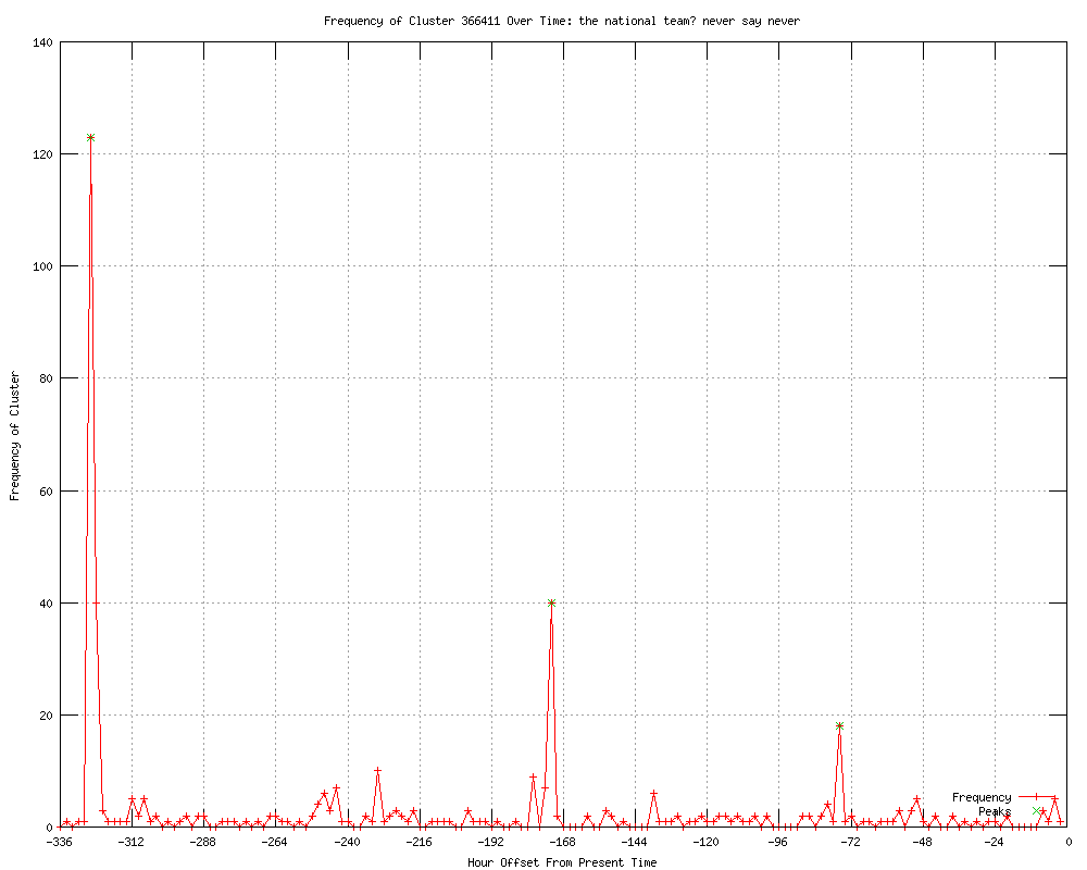 | 7 | the national team? never say never Urls http://goal.com/en/news/2898/euro-2012/2012/01/23/2862713/romas-francesco-totti-open-to-italy-return-for-euro-2012 http://ca.rd.yahoo.com/sports/rss/sow/SIG=12dhgon8q/*http%3A//ca.sports.yahoo.com/sow/news?slug=goal-romasfrancescotottiopentoit http://uk.news.yahoo.com/romas-francesco-totti-open-italy-211800417--soccer.html http://us.rd.yahoo.com/sports/rss/sow/SIG=12a9kudi0/*http%3A//sports.yahoo.com/sow/news?slug=goal-romasfrancescotottiopentoit http://soccerway.com/news/2012/January/24/totti-considers-italy-return http://soccernews.com/totti-considers-italy-return/87325/ http://foreign.peacefmonline.com/sports/201201/90555.php |