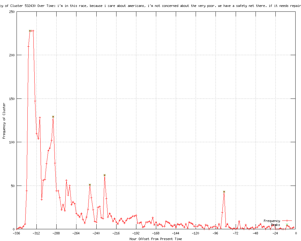 | 4 | i'm in this race because i care about americans. i'm not concerned about the very poor. we have a safety net there Urls http://splendoroftruth.com/curtjester/2012/02/channeling-scrooge/ http://freerepublic.com/focus/f-news/2841047/posts http://punditandpundette.com/2012/02/mr-electable-hones-his-message-im-not.html http://takeastandagainstliberals.blogspot.com/2012/02/mitt-romney-couldnt-care-less.html |