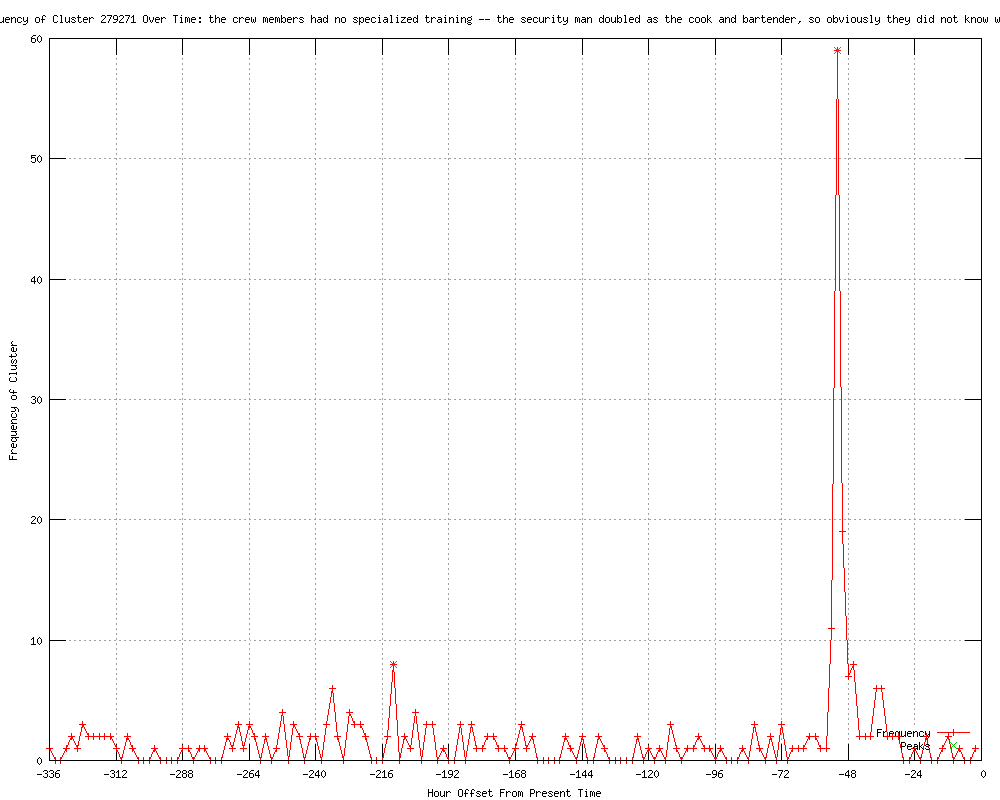 | 5 | the crew members had no specialized training-the security man doubled as the cook and bartender, so obviously they did not know what to do Urls http://breitbart.com/article.php?id=D9SBEUBG0&show_article=1 http://breitbart.com/article.php?id=D9SBG9400&show_article=1 http://breitbart.com/article.php?id=D9SBHK383&show_article=1 http://breitbart.com/article.php?id=D9SBHVQO0&show_article=1 http://japantoday.com/category/world/view/italian-cruise-ship-tally-11-dead-21-missing |