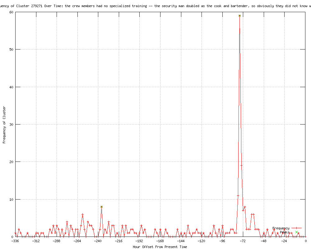 | 120 | the crew members had no specialized training - the security man doubled as the cook and bartender, so obviously they did not know what to do Urls http://sg.news.yahoo.com/hungarian-cruise-ship-victim-crew-violinist-161156560.html http://toledoblade.com/World/2012/01/18/Italy-names-28-missing-from-the-cruise-ship-search-teams-suspend-operations-as-boat-shifts.html http://brownsvilleherald.com/articles/rome-135964-cruise-italians.html http://courierpress.com/news/2012/jan/18/cruise-ship-rescue-operations-suspended-22-still-m/?partner=RSS http://my.news.yahoo.com/italians-name-28-missing-cruise-passengers-crew-140803822.html http://orangeleader.com/topstories/x1405465408/Italians-name-28-missing-cruise-passengers-crew http://ajc.com/business/italians-name-28-missing-1306787.html?cxtype=rss_news_82111 http://kdwn.com/index.php?page=2§ion=WORLD_NEWS&title=Italians_name_28_missing_cruise_passengers,_crew http://seattlepi.com/business/article/Hungarian-cruise-ship-victim-was-crew-violinist-2608550.php http://kwwl.com/story/16544729/italy-pm-thanks-giglio-for-welcoming-ship-refugees http://kswo.com/story/16544729/italy-pm-thanks-giglio-for-welcoming-ship-refugees http://kxxv.com/story/16544729/italy-pm-thanks-giglio-for-welcoming-ship-refugees http://wlox.com/story/16544729/italy-pm-thanks-giglio-for-welcoming-ship-refugees http://kusi.com/story/16544729/italy-pm-thanks-giglio-for-welcoming-ship-refugees http://news9.com/story/16544729/italy-pm-thanks-giglio-for-welcoming-ship-refugees http://wlbt.com/story/16544729/italy-pm-thanks-giglio-for-welcoming-ship-refugees http://ksla.com/story/16544729/italy-pm-thanks-giglio-for-welcoming-ship-refugees http://wect.com/story/16544729/italy-pm-thanks-giglio-for-welcoming-ship-refugees http://kwqc.com/Global/story.asp?S=16544729 http://ktvn.com/story/16544729/italy-pm-thanks-giglio-for-welcoming-ship-refugees http://digitalburg.com/artman2/publish/National_Affairs_59/Italians_name_28_missing_cruise_passengers_crew.shtml http://kyivpost.com/news/world/detail/120763/ http://wkrn.com/story/16544729/italy-pm-thanks-giglio-for-welcoming-ship-refugees http://.nbc17.com/news/2012/jan/18/search-ship-survivors-suspended-day-captain-still--ar-1827736/ http://klkntv.com/story/16544729/italy-pm-thanks-giglio-for-welcoming-ship-refugees http://kcautv.com/story/16544729/italy-pm-thanks-giglio-for-welcoming-ship-refugees http://mysanantonio.com/business/article/Italians-name-28-missing-cruise-passengers-crew-2588067.php http://woi-tv.com/story/16544729/italy-pm-thanks-giglio-for-welcoming-ship-refugees http://cbs3springfield.com/story/16544729/italy-pm-thanks-giglio-for-welcoming-ship-refugees http://kare11.com/rss/article/957226/391/28-missing-Italian-cruise-passengers-crew-named- http://kswt.com/story/16544729/italy-pm-thanks-giglio-for-welcoming-ship-refugees http://wten.com/story/16544729/italy-pm-thanks-giglio-for-welcoming-ship-refugees http://wric.com/story/16544729/italy-pm-thanks-giglio-for-welcoming-ship-refugees http://cbsnews.com/8301-202_162-57361125/cruise-violinist-idd-as-disasters-first-victim/ http://wrex.com/story/16544729/italy-pm-thanks-giglio-for-welcoming-ship-refugees http://ckom.com/content/italians-name-28-missing-cruise-passengers-crew http://kcbd.com/story/16544729/italy-pm-thanks-giglio-for-welcoming-ship-refugees http://wmbfnews.com/story/16544729/italy-pm-thanks-giglio-for-welcoming-ship-refugees http://guardian.co.uk/world/feedarticle/10047541 http://sunjournal.com/news/news/2012/01/18/italian-government-releases-names-those-still-miss/1142889 http://ktiv.com/story/16544729/italy-pm-thanks-giglio-for-welcoming-ship-refugees http://knoe.com/story/16544729/italy-pm-thanks-giglio-for-welcoming-ship-refugees http://sg.news.yahoo.com/german-woman-alive-cruise-ship-missing-21-174258018.html http://ajc.com/business/german-woman-is-alive-1306787.html?cxtype=rss_news_82111 http://kmph.com/story/16544729/italy-pm-thanks-giglio-for-welcoming-ship-refugees http://feeds.cbsnews.com/~r/CBSNewsMain/~3/Xay2lxO5ytc/ http://seattlepi.com/news/article/Italians-name-28-missing-cruise-passengers-crew-2608550.php http://wandtv.com/story/16544729/italy-pm-thanks-giglio-for-welcoming-ship-refugees http://newson6.com/story/16544729/italy-pm-thanks-giglio-for-welcoming-ship-refugees http://kdwn.com/index.php?page=2§ion=WORLD_NEWS&title=German_woman_is_alive,_cruise_ship_missing_at_21 http://feeds.cbsnews.com/~r/CBSNewsWorld/~3/IlqI-cEIbcE/ http://sunjournal.com/node/1142889 http://cbsnews.com/8301-202_162-57361125/cruise-violinist-is-first-disaster-victim-idd/ http://news.yahoo.com/german-woman-alive-cruise-ship-missing-21-174258018.html http://theskanner.com/article/VIDEO-German-Woman-is-Alive-Cruise-Ship-Missing-21-Passengers-2012-01-18 http://wbay.com/story/16544729/italy-pm-thanks-giglio-for-welcoming-ship-refugees http://newstimes.com/news/article/German-woman-is-alive-cruise-ship-missing-at-21-2608550.php http://mysanantonio.com/news/article/German-woman-is-alive-cruise-ship-missing-at-21-2608550.php http://kare11.com/rss/article/957226/391/Missing-Italian-cruise-passengers-crew-named- http://huffingtonpost.com/2012/01/18/costa-concordia-victim-sandor-feher-hungary_n_1213387.html http://wkyc.com/news/national/225746/22/Two-Americans-on-list-of-missing-in-Italy-ship-disaster http://wkyc.com/news/article/225746/45/Two-Americans-on-list-of-missing-in-Italy-ship-disaster http://wkyc.com/news/article/225746/45/Two-Americans-on-list-of-missing-in-Italy-ship-disaster?odyssey=tab%7Ctopnews%7Cbc%7Clarge http://seattlepi.com/news/article/German-woman-is-alive-cruise-ship-missing-at-21-2608550.php http://globalnews.ca/Canada/italy+names+28+missing+from+the+cruise+ship+search+teams+suspend+operations+as+boat+shifts2/6442562085/story.html http://feeds.cbsnews.com/~r/CBSNewsWorld/~3/Xay2lxO5ytc/ http://globalnews.ca/Canada/italy+names+those+missing+from+the+cruise+ship+search+teams+suspend+operations+as+boat+shifts2/6442562085/story.html http://sg.news.yahoo.com