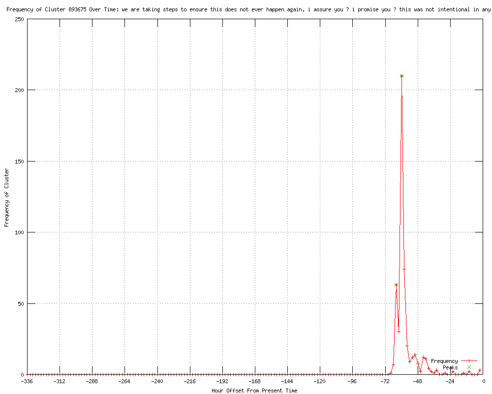 | 16 | i assure you -- i promise you -- this was not intentional in any way Urls http://defense.gov//news/newsarticle.aspx?id=67260 http://yubanet.com/usa/Panetta-Allen-Apologize-for-Destruction-of-Religious-Materials.php http://globalsecurity.org/military/library/news/2012/02/mil-120221-afps02.htm http://feeds.nydailynews.com/~r/nydnrss/sports/hockey/islanders/~3/GUU3IcVfvWg/angry-protesters-surge-american-air-base-setting-fired-throwing-rocks-copies-quran-bruned-pile-garbage-article-1.1026199 http://deccanchronicle.com/channels/world/north-america/afghan-inmates-passed-messages-korans-us-officials-555 http://perthnow.com.au/news/breaking-news/afghan-inmates-passed-messages-in-korans/story-e6frg12u-1226278043558?from=public_rss http://adelaidenow.com.au/news/breaking-news/afghan-inmates-passed-messages-in-korans/story-e6frea73-1226278043558?from=public_rss http://news.com.au/breaking-news/afghan-inmates-passed-messages-in-korans/story-e6frfku0-1226278043558 http://dailytelegraph.com.au/news/breaking-news/afghan-inmates-passed-messages-in-korans/story-e6freuyi-1226278043558 http://heraldsun.com.au/news/breaking-news/afghan-inmates-passed-messages-in-korans/story-e6frf7jx-1226278043558 http://spacewar.com/reports/Afghan_inmates_passed_messages_in_Korans_officials_999.html http://presszoom.com/story_173330.html http://hclindia.com/node/1067946 http://indiafeatures.com/node/1067946 http://webnewswire.com/node/1067946 http://broadcastindia.com/node/1067946 |