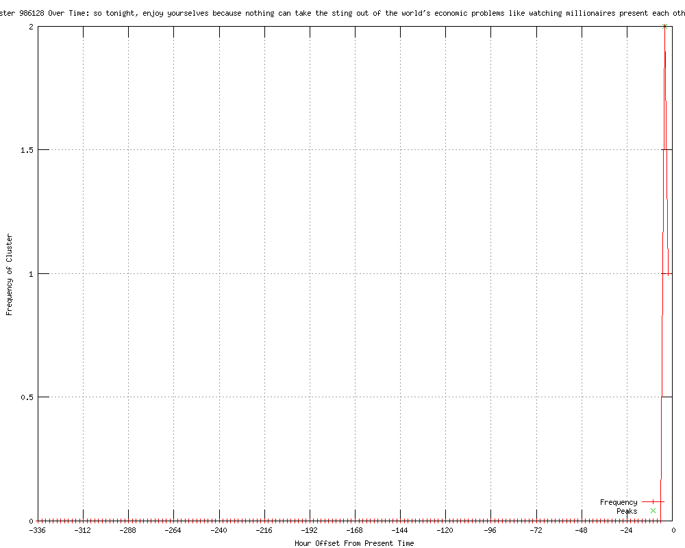| 19 | so tonight, enjoy yourselves because nothing can take the sting out of the world's economic problems like watching millionaires present each other with golden statues Urls http://us.rd.yahoo.com/dailynews/rss/entertainment/*http://us.rd.yahoo.com/dailynews/external/omg_rss/rss_omg_en/news_factbox_memorable_quotes_oscars040138184/44655582/*http://omg.yahoo.com/news/factbox-memorable-quotes-oscars-040138184.html http://in.reuters.com/article/2012/02/27/oscars-quotes-idINDEE81Q07X20120227?feedType=RSS&feedName=entertainmentNews http://moneycontrol.com/news/wire-news/factbox-memorable-quotes-fromoscars_673524.html http://q106fm.com/news/articles/2012/feb/27/billy-crystal-returns-for-9th-stint-as-oscars-host/ http://omg.yahoo.com/news/billy-crystal-returns-9th-stint-oscars-host-032055456.html http://wqtx.net/news/articles/2012/feb/27/billy-crystal-returns-for-9th-stint-as-oscars-host/ http://in.reuters.com/article/2012/02/27/us-oscars-show-idINTRE81Q0B320120227?feedType=RSS&feedName=hollywood http://reuters.com/article/2012/02/27/us-oscars-show-idUSTRE81Q0B320120227?feedType=RSS&feedName=entertainmentNews http://reuters.com/article/2012/02/27/us-oscars-show-idUSTRE81Q0B320120227?feedType=RSS&feedName=entertainmentNews&rpc=22&sp=true http://us.rd.yahoo.com/dailynews/rss/entertainment/*http://us.rd.yahoo.com/dailynews/external/omg_rss/rss_omg_en/news_billy_crystal_returns9th_stint_oscars_host_032055456/44655212/*http://omg.yahoo.com/news/billy-crystal-returns-9th-stint-oscars-host-032055456.html http://publicbroadcasting.net/wabe/news.newsmain/article/0/8/1908022/Entertainment.News/Billy.Crystal.returns.for.9th.stint.as.Oscars.host http://au.news.yahoo.com/a/-/world/13026001/billy-crystal-returns-for-9th-stint-as-oscars-host/ http://au.news.yahoo.com/world/a/-/world/13026001/billy-crystal-returns-for-9th-stint-as-oscars-host/ http://wsny.net/content_page.php?contentType=4&contentId=10065738&fGId=21525&fGCTId=47&tempId=27007&tId=1&gId=172 http://kgmi.com/content_page.php?contentType=4&contentId=10065738&fGId=21525&fGCTId=47&tempId=28702&tId=1&gId=172 http://kgmi.com/Billy-Crystal-returns-for-9th-stint-as-Oscars-host/12381363 http://in.reuters.com/article/2012/02/27/oscars-show-idINDEE81Q05Y20120227?feedType=RSS&feedName=entertainmentNews http://omg.yahoo.com/news/factbox-memorable-quotes-oscars-040138184.html http://dnaindia.com/entertainment/report_billy-crystal-returns-for-9th-stint-as-oscars-host_1655434 |
