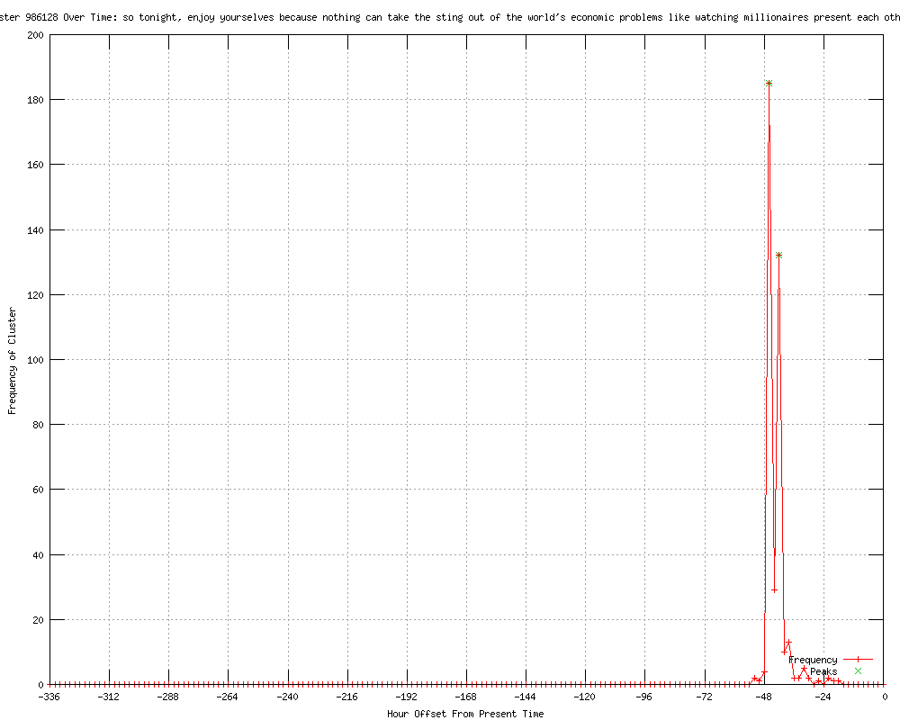 | 33 | so tonight, enjoy yourselves because nothing can take the sting out of the world's economic problems like watching millionaires present each other with golden statues Urls http://us.rd.yahoo.com/dailynews/rss/entertainment/*http://us.rd.yahoo.com/dailynews/external/omg_rss/rss_omg_en/news_factbox_memorable_quotes_oscars040138184/44655582/*http://omg.yahoo.com/news/factbox-memorable-quotes-oscars-040138184.html http://in.reuters.com/article/2012/02/27/oscars-quotes-idINDEE81Q07X20120227?feedType=RSS&feedName=entertainmentNews http://moneycontrol.com/news/wire-news/factbox-memorable-quotes-fromoscars_673524.html http://q106fm.com/news/articles/2012/feb/27/billy-crystal-returns-for-9th-stint-as-oscars-host/ http://omg.yahoo.com/news/billy-crystal-returns-9th-stint-oscars-host-032055456.html http://wqtx.net/news/articles/2012/feb/27/billy-crystal-returns-for-9th-stint-as-oscars-host/ http://in.reuters.com/article/2012/02/27/us-oscars-show-idINTRE81Q0B320120227?feedType=RSS&feedName=hollywood http://reuters.com/article/2012/02/27/us-oscars-show-idUSTRE81Q0B320120227?feedType=RSS&feedName=entertainmentNews http://reuters.com/article/2012/02/27/us-oscars-show-idUSTRE81Q0B320120227?feedType=RSS&feedName=entertainmentNews&rpc=22&sp=true http://us.rd.yahoo.com/dailynews/rss/entertainment/*http://us.rd.yahoo.com/dailynews/external/omg_rss/rss_omg_en/news_billy_crystal_returns9th_stint_oscars_host_032055456/44655212/*http://omg.yahoo.com/news/billy-crystal-returns-9th-stint-oscars-host-032055456.html http://publicbroadcasting.net/wabe/news.newsmain/article/0/8/1908022/Entertainment.News/Billy.Crystal.returns.for.9th.stint.as.Oscars.host http://au.news.yahoo.com/a/-/world/13026001/billy-crystal-returns-for-9th-stint-as-oscars-host/ http://au.news.yahoo.com/world/a/-/world/13026001/billy-crystal-returns-for-9th-stint-as-oscars-host/ http://wsny.net/content_page.php?contentType=4&contentId=10065738&fGId=21525&fGCTId=47&tempId=27007&tId=1&gId=172 http://kgmi.com/content_page.php?contentType=4&contentId=10065738&fGId=21525&fGCTId=47&tempId=28702&tId=1&gId=172 http://kgmi.com/Billy-Crystal-returns-for-9th-stint-as-Oscars-host/12381363 http://in.reuters.com/article/2012/02/27/oscars-show-idINDEE81Q05Y20120227?feedType=RSS&feedName=entertainmentNews http://omg.yahoo.com/news/factbox-memorable-quotes-oscars-040138184.html http://dnaindia.com/entertainment/report_billy-crystal-returns-for-9th-stint-as-oscars-host_1655434 http://publicbroadcasting.net/wabe/news.newsmain/article/0/8/1908078/Entertainment.News/Billy.Crystal.back.to.basics.in.Oscar.host.comeback http://au.news.yahoo.com/a/-/world/13030961/billy-crystal-back-to-basics-in-oscar-host-comeback/ http://au.news.yahoo.com/world/a/-/world/13030961/billy-crystal-back-to-basics-in-oscar-host-comeback/ http://abs-cbnnews.com/entertainment/02/27/12/early-reviews-oscar-show-mostly-negative http://reuters.com/article/2012/02/27/us-oscars-show-idUSTRE81Q0B320120227 http://rp1.abs-cbnnews.com/entertainment/02/27/12/early-reviews-oscar-show-mostly-negative http://jewishjournal.com/hollywood/article/billy_crystal_back_to_basics_in_oscar_host_comeback_20120227/ http://kgmi.com/Billy-Crystal-back-to-basics-at-Oscars-VIDEO-/12381363 http://moneycontrol.com/news/wire-news/factbox-memorable-quotes-fromoscars_673590.html http://in.reuters.com/article/2012/02/27/oscars-quotes-idINDEE81Q0A620120227?feedType=RSS&feedName=entertainmentNews http://radiotimes.com/news/2012-02-27/oscars-2012-the-awards-in-quotes http://ibtimes.com/articles/305058/20120227/oscars-2012-memorable-celebrity-quotes-84th-annual.htm http://bbc.co.uk/news/entertainment-arts-17175876 http://telegraph.feedsportal.com/c/32726/f/568348/s/1cfa0f36/l/0L0Stelegraph0O0Cculture0Cfilm0Coscars0C910A91340COscars0E20A120E10A0Ebest0Equotes0Bhtml/story01.htm |