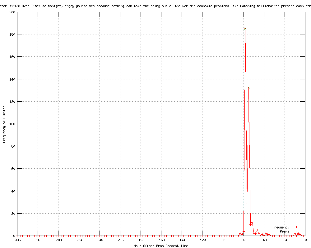 | 14 | since nothing can take the sting out of the world's economic problems like watching millionaires present each other with golden statues Urls http://omg.yahoo.com/news/billy-crystal-returns-host-winning-oscarcast-053034655.html http://entertainment.msn.com/tv/article.aspx?news=707133&affid=100055 http://us.rd.yahoo.com/dailynews/rss/entertainment/*http://us.rd.yahoo.com/dailynews/external/omg_rss/rss_omg_en/news_billy_crystal_returns_host_winning_oscarcast053034655/44656169/*http://omg.yahoo.com/news/billy-crystal-returns-host-winning-oscarcast-053034655.html http://artesianews.com/ap-news/united-states-ap-news/billy-crystal-returns-to-host-a-winning-oscarcast/ http://artesianews.com/ap-news/united-states-ap-news/billy-crystal-returns-to-host-a-winning-oscarcast-2/ http://entertainment.msn.com/news/article.aspx?news=707134&affid=100055 http://sfgate.com/cgi-bin/article.cgi?f=/n/a/2012/02/26/national/a213000S86.DTL&feed=rss.news_nation http://jconline.com/viewart/20120227/ENT/120227003/Review-Crystal-returns-host-winning-Oscarcast-?odyssey=mod|newswell|text|FRONTPAGE|s http://utsandiego.com/news/2012/feb/26/billy-crystal-returns-to-host-a-winning-oscarcast/ http://sify.com/movies/billy-crystal-returns-to-host-a-winning-oscarcast-news-hollywood-mc1lNPehbee.html?scategory=hollywood http://us.rd.yahoo.com/finance/news/rss/story/*http://finance.yahoo.com/news/Billy-Crystal-returns-host-apf-656623178.html?x=0 http://cbsnews.com/8301-505245_162-57385861/billy-crystal-returns-to-host-a-winning-oscarcast/ http://jconline.com/article/20120227/ENT/120227003/Review-Crystal-returns-host-winning-Oscarcast http://thespec.com/whatson/article/677638--it-was-just-like-old-times-and-that-was-just-fine |