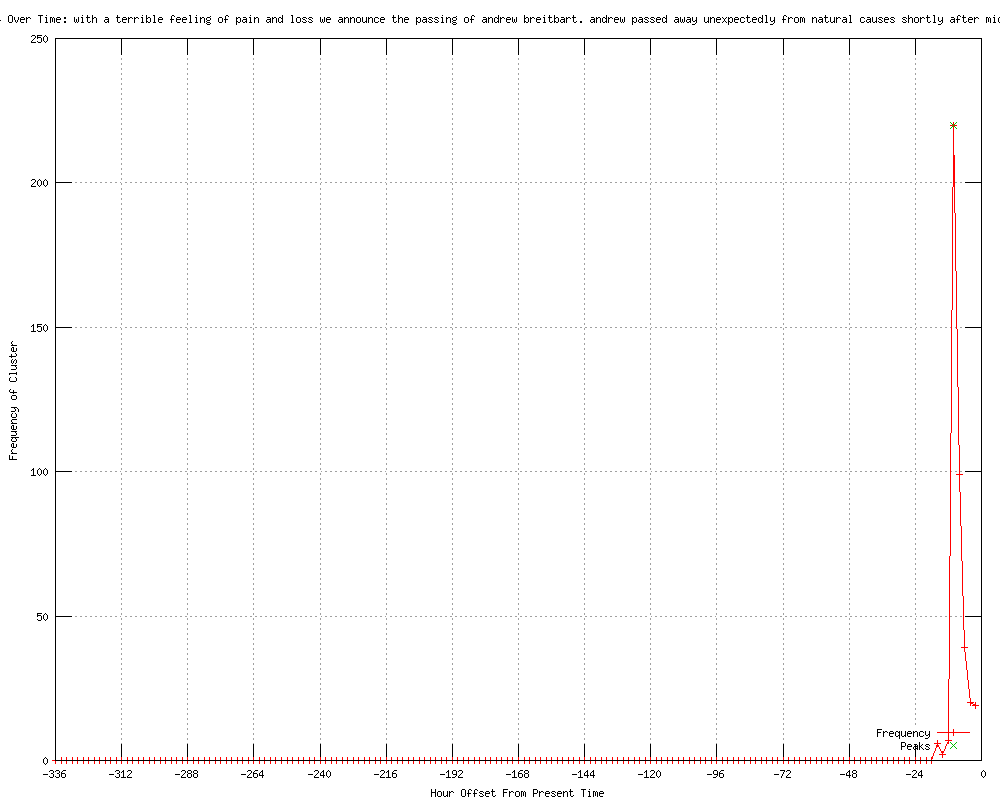 | 5 | passed away unexpectedly from natural causes shortly after midnight this morning in los angeles Urls http://advocate.com/News/Daily_News/2012/03/01/Andrew_Breitbart_Dead_at_43/ http://blogs.laweekly.com/informer/2012/03/andrew_breitbart_dead_la_blogger_collapsed_brentwood.php http://out.com/entertainment/popnography/2012/03/01/andrew-breitbart-dead-43 http://redhatgirl.com/andrew-breitbart-dead-at-43-conservative-l-a-blogger-reportedly-collapses-in-brentwood/ http://qpdx.com/2012/03/andrew-breitbart-dead-at-43/ |