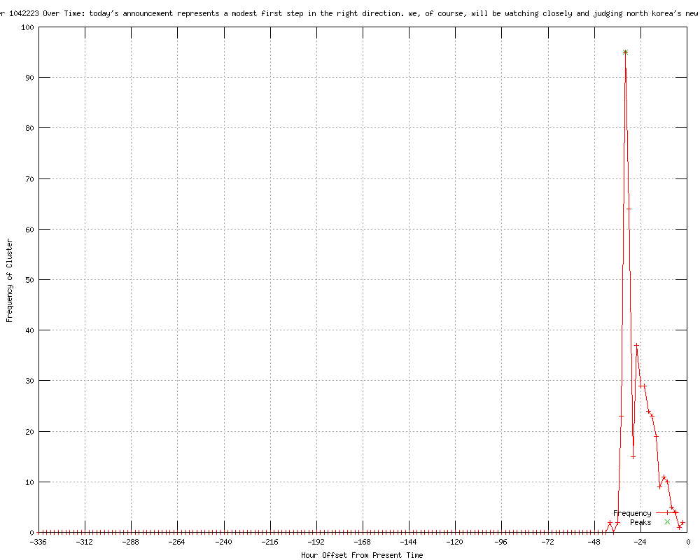 | 83 | today's announcement represents a modest first step in the right direction Urls http://thisishell.net/nine-circles-of-hell/nine-circles-of-hell-wednesday-february-29-2012/ http://cnn.com/2012/02/29/world/asia/north-korea-timeline/index.html?eref=rss_latest http://thaindian.com/newsportal/world-news/north-koreas-n-activity-suspension-modest-first-step-clinton_100601358.html http://indiatalkies.com/2012/02/north-koreas-nactivity-suspension-modest-step-clinton.html http://europe.chinadaily.com.cn/world/2012-03/01/content_14728448.htm http://spacewar.com/reports/Republicans_criticize_US_N_Korea_deal_999.html http://feeds.bignewsnetwork.com/?sid=203892434 http://hamaraphotos.com/news/international/north-koreas-n-activity-suspension-modest-first-step-us.html http://indiatalkies.com/2012/02/north-koreas-nactivity-suspension-modest-step.html http://news.worldsnap.com/international/united-states/north-koreas-n-activity-suspension-modest-first-step-us-120786.html http://mysinchew.com/node/70799 http://sammyboy.com/showthread.php?111220-N-Korea-US-agree-on-nuclear-halt&goto=newpost http://talkradionews.com/news/2012/02/29/north-korea-agrees-to-nuclear-moratorium.html http://publicbroadcasting.net/wuky/news.newsmain/article/0/0/1908852/World/North.Korea.agrees.to.nuclear.moratorium..IAEA.inspections http://kgmi.com/North-Korea-agrees-to-nuclear-moratorium-IAEA-insp/11461924?newsId=130145 http://au.news.yahoo.com/world/a/-/world/13054364/north-korea-agrees-to-nuclear-moratorium-iaea-inspections/ http://reuters.com/article/2012/02/29/us-korea-north-usa-talks-idUSTRE81S13R20120229?feedType=RSS&feedName=wtMostRead http://publicbroadcasting.net/wabe/news.newsmain/article/0/0/1908852/World/North.Korea.agrees.to.nuclear.moratorium..IAEA.inspections http://publicbroadcasting.net/wkyu/news.newsmain/article/0/0/1908852/World/North.Korea.agrees.to.nuclear.moratorium..IAEA.inspections http://publicbroadcasting.net/wkyu/news.newsmain/article/0/0/1908854/Top.Stories/North.Korea.agrees.to.nuclear.moratorium..IAEA.inspections http://timesofindia.indiatimes.com/world/rest-of-world/North-Korea-agrees-to-nuclear-moratorium-US-to-give-food-aid/articleshow/12087558.cms http://da.feedsportal.com/c/33039/f/555218/s/46a068dc/l/0Ltimesofindia0Bindiatimes0N0Cworld0Crest0Eof0Eworld0CNorth0EKorea0Eagrees0Eto0Enuclear0Emoratorium0EUS0Eto0Egive0Efood0Eaid0Carticleshow0C120A875580Bcms/ia1.htm http://abcnews.go.com/blogs/headlines/2012/02/north-korea-to-halt-nuke-program-for-food/ http://reuters.com/article/2012/02/29/us-korea-north-usa-talks-idUSTRE81S13R20120229?feedType=RSS&feedName=politicsNews http://in.reuters.com/article/2012/02/29/korea-north-usa-idINDEE81S0GX20120229?feedType=RSS&feedName=topNews http://zeenews.india.com/news/world/north-korea-agrees-to-nuclear-moratorium_761415.html http://reuters.com/article/2012/02/29/us-korea-north-usa-talks-idUSTRE81S13R20120229?feedType=RSS&feedName=politicsNews&rpc=22&sp=true http://kgmi.com/North-Korea-agrees-to-nuclear-moratorium-IAEA-insp/11461903?newsId=130153 http://thehill.com/video/administration/213355-hillary-clinton-north-korea-nuclear-testing-halt-is-a-modest-first-step- http://wnep.com/news/sns-rt-us-korea-north-usa-talkstre81s13r-20120229,0,723198.story http://twocircles.net/2012mar01/north_koreas_nactivity_suspension_modest_first_step_clinton_0041.html http://twocircles.net/2012mar01/north_koreas_nactivity_suspension_modest_first_step_clinton.html http://dnaindia.com/world/report_north-korea-agrees-to-nuclear-moratorium-iaea-inspections_1656782 http://feeds.reuters.com/%7Er/Reuters/PoliticsNews/%7E3/iW0WivGVANI/us-korea-north-usa-talks-idUSTRE81S13R20120229 http://abc.net.au/news/2012-03-01/n-korea-agrees-to-nuclear-moratorium/3861406 http://feeds.bignewsnetwork.com/?sid=203884699 http://au.news.yahoo.com/a/-/business/13055532/n-korea-halts-nuclear-tests-for-food-aid/ http://au.news.yahoo.com/a/-/latest/13055532/n-korea-halts-nuclear-tests-for-food-aid/ http://au.news.yahoo.com/latest/a/-/article/13055532/n-korea-halts-nuclear-tests-for-food-aid/ http://wvpe.org/index.php?id=147654942&type=story&PHPSESSID=2859fbf4a8654ad196e6abdfe3f827a7 http://wyomingpublicradio.net/post/n-korea-halt-nuclear-tests-us-provide-aid http://npr.org/2012/02/29/147654942/n-korea-to-halt-nuclear-tests-u-s-to-provide-aid?ft=1&f=1001 http://npr.org/2012/02/29/147654942/n-korea-to-halt-nuclear-tests-u-s-to-provide-aid?ft=1&f=2 http://publicradiodelmarva.net/post/n-korea-halt-nuclear-tests-us-provide-aid http://wyomingpublicmedia.org/post/n-korea-halt-nuclear-tests-us-provide-aid http://wncw.org/post/n-korea-halt-nuclear-tests-us-provide-aid http://kunm.org/post/n-korea-halt-nuclear-tests-us-provide-aid http://pba.org/post/n-korea-halt-nuclear-tests-us-provide-aid http://kalw.org/post/n-korea-halt-nuclear-tests-us-provide-aid http://kbia.org/post/n-korea-halt-nuclear-tests-us-provide-aid http://kclu.org/npr/?id=147654942 http://redriverradio.org/post/n-korea-halt-nuclear-tests-us-provide-aid http://krwg.org/post/n-korea-halt-nuclear-tests-us-provide-aid http://gpb.org/news/2012/02/29/n-korea-to-halt-nuclear-tests-u-s-to-provide-aid http://kios.org/post/n-korea-halt-nuclear-tests-us-provide-aid http://kunc.org/post/n-korea-halt-nuclear-tests-us-provide-aid http://upr.org/post/n-korea-halt-nuclear-tests-us-provide-aid http://wesm913.org/post/n-korea-halt-nuclear-tests-us-provide-aid http://wkar.org/post/n-korea-halt-nuclear-tests-us-provide-aid http://wknofm.org/post/n-korea-halt-nuclear-tests-us-provide-aid http://kosu.org/2012/02/n-korea-to-halt-nuclear-tests-u-s-to-provide-aid/ http://scotsman.com/north_korea_agrees_to_stop_nuclear_tests_in_exchange_for_us_food_aid_1_2145704 http://channelnewsasia.com/stories/afp_asiapacific/view/1186231/1/.html http://daijiworld.com/news/news_disp.asp?n_id=130662 http://uk.news.yahoo.com/china-backs-us-n-korea-nuclear-freeze-deal-044201750.html http://ph.news.yahoo.com/china-backs-us-n-korea-nuclear-freeze-deal-044201468.html http://breitbart.com/articl