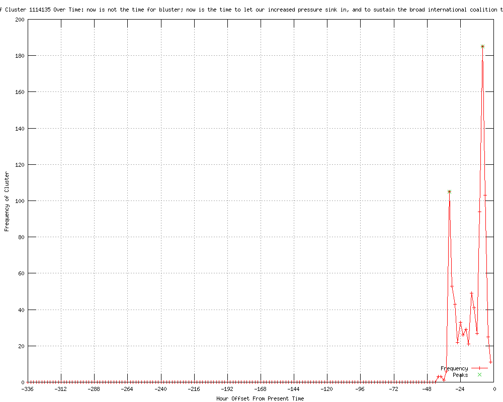 | 5 | now is not the time for bluster; now is the time to let our increased pressure sink in, and to sustain the broad international coalition that we have built Urls http://nation.foxnews.com/barack-obama/2012/03/04/obama-iran-too-much-loose-talk-war http://thedailybeast.com/articles/2012/03/05/obama-and-netanyahu-s-competing-red-lines-for-attacking-iran.html http://ipsnews.net/2012/03/obama-to-pro-israel-lobby-group-too-much-loose-talk-of-war/ http://cbsnews.com/8301-503544_162-57390270-503544/as-obama-speaks-at-aipac-romney-serves-pancakes-and-hits-him-on-iran/ http://feeds.cbsnews.com/%7Er/CBSNewsTravelGuru/%7E3/2dYK8lHfF5M/ |