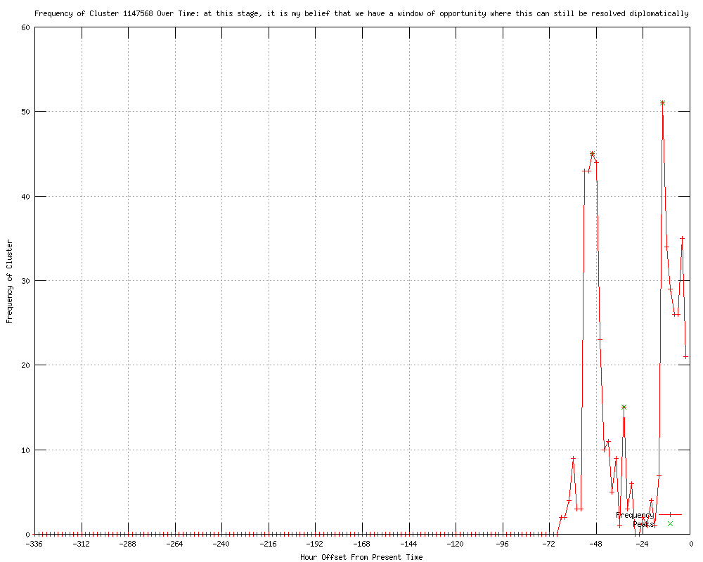 | 5 | it is my belief that we have a window of opportunity where this can still be resolved diplomatically Urls http://thinkprogress.org/security/2012/03/06/439013/obama-gop-casualness-war/ http://patrickhenrypress.info/node/584086 http://leftword.blogdig.net/archives/articles/March2012/06/Obama_Hits_GOP_Presidential_Candidates_For_The___8216_Casualness_With_Which__8217__They___8216_Talk_About_War__8217_.html http://jta.org/news/article/2012/03/06/3092026/obama-and-netanyahu-disagree-in-private-and-in-public http://jewishjournal.com/world/article/obama_and_netanyahu_disagree_in_private_and_in_public_20120306/ |