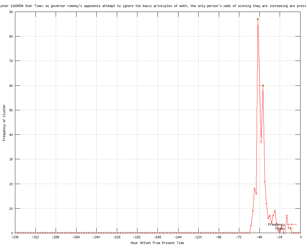 | 11 | as governor romney's opponents attempt to ignore the basic principles of math, the only person's odds of winning they are increasing are president barack obama 's Urls http://newsday.com/news/nation/romney-politely-encourages-rivals-to-fold-1.3584600 http://newsday.com/news/nation/romney-politely-encourages-rivals-to-fold-1.3584428 http://newsday.com/news/nation/romney-encourages-rivals-to-fold-no-way-they-say-1.3584428 http://newsday.com/news/nation/romney-politely-encourages-rivals-to-fold-1.3586733 http://newsday.com/news/nation/romney-encourages-rivals-to-fold-no-way-they-say-1.3584600 http://newsday.com/news/nation/romney-encourages-rivals-to-fold-no-way-they-say-1.3586831 http://newsday.com/news/nation/romney-encourages-rivals-to-fold-no-way-they-say-1.3587015 http://wsbradio.com/ap/ap/general/rivals-vow-to-fight-on-despite-romneys-nudge/nLNT7/ http://newsday.com/news/nation/rivals-vow-to-fight-on-despite-romney-s-nudge-1.3584600 http://newsday.com/news/nation/rivals-vow-to-fight-on-despite-romney-s-nudge-1.3586831 http://newsday.com/news/nation/rivals-vow-to-fight-on-despite-romney-s-nudge-1.3587321 |