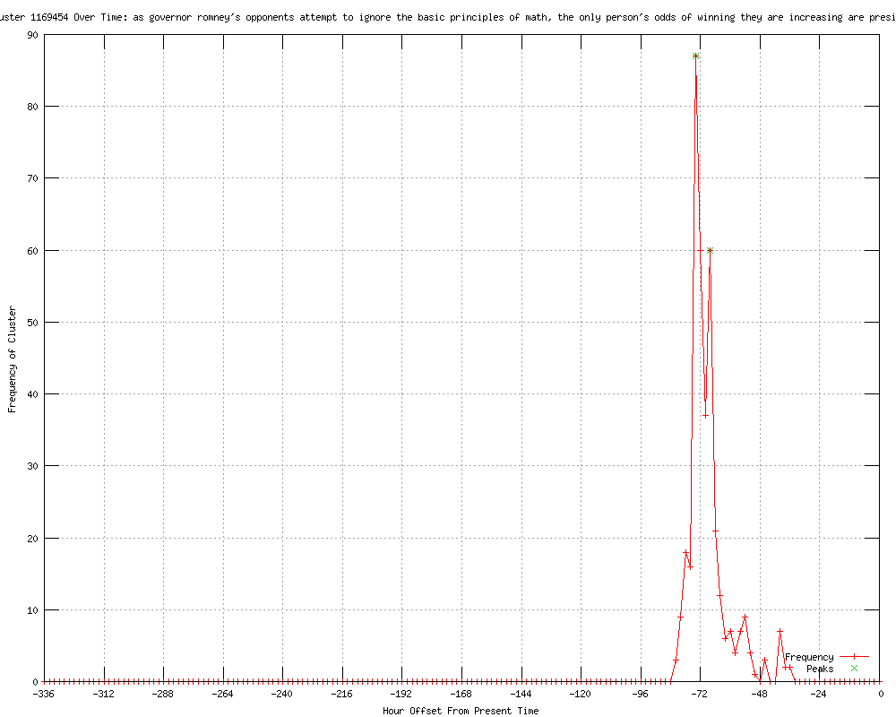 | 11 | as governor romney's opponents attempt to ignore the basic principles of math, the only person's odds of winning they are increasing are president barack obama 's Urls http://newsday.com/news/nation/romney-politely-encourages-rivals-to-fold-1.3584600 http://newsday.com/news/nation/romney-politely-encourages-rivals-to-fold-1.3584428 http://newsday.com/news/nation/romney-encourages-rivals-to-fold-no-way-they-say-1.3584428 http://newsday.com/news/nation/romney-politely-encourages-rivals-to-fold-1.3586733 http://newsday.com/news/nation/romney-encourages-rivals-to-fold-no-way-they-say-1.3584600 http://newsday.com/news/nation/romney-encourages-rivals-to-fold-no-way-they-say-1.3586831 http://newsday.com/news/nation/romney-encourages-rivals-to-fold-no-way-they-say-1.3587015 http://wsbradio.com/ap/ap/general/rivals-vow-to-fight-on-despite-romneys-nudge/nLNT7/ http://newsday.com/news/nation/rivals-vow-to-fight-on-despite-romney-s-nudge-1.3584600 http://newsday.com/news/nation/rivals-vow-to-fight-on-despite-romney-s-nudge-1.3586831 http://newsday.com/news/nation/rivals-vow-to-fight-on-despite-romney-s-nudge-1.3587321 |