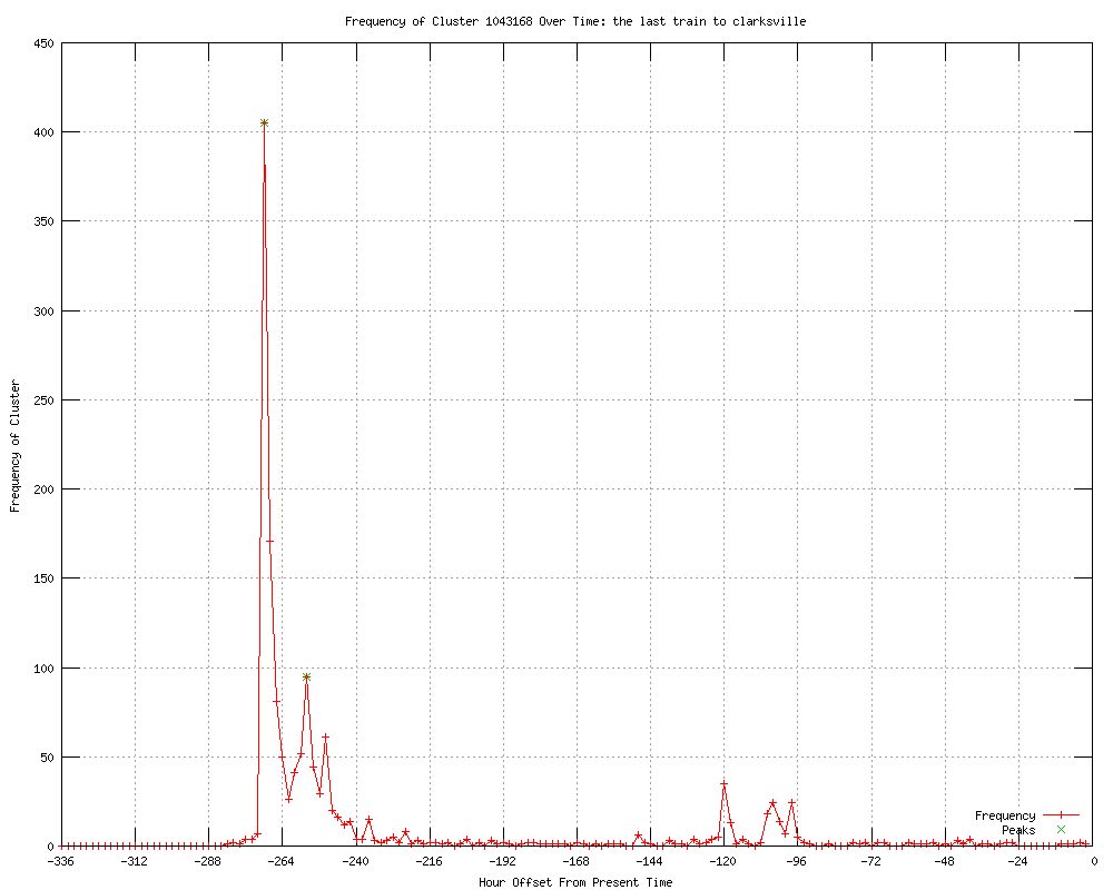 | 8 | the last train to clarksville Urls http://webpronews.com/davy-jones-dead-2012-02 http://wik.io/info/US/317630558 http://allieiswired.com/archives/2012/02/davy-jones-of-the-monkees-dead-at-66/ http://blog.devshirme.com/2012/02/davy-jones-rip/ http://ChicagoTribune.feedsportal.com/c/34253/f/622826/s/1d0d27f1/l/0L0Schicagotribune0N0Cnews0Ccolumnists0Cct0Emet0Ekass0E0A30A10E20A120A30A10H0A0H4827990Bcolumn0Dtrack0Frss/story01.htm http://findata.co.nz/News/14792937/Being_a_believer_is_a_little_bit_me_and_a_little_bit_you.htm http://chicagotribune.com/news/columnists/ct-met-kass-0301-20120301,0,482799.column?track=rss http://chicagotribune.com/news/columnists/ct-met-kass-0301-20120301,0,482799.column |