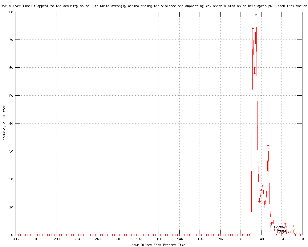 | 16 | i appeal to the security council to unite strongly behind ending the violence and supporting mr. annan's mission to help syria pull back from the brink of a deeper catastrophe Urls http://rferl.org/content/syria_violence_dominates_un_security_council_arab_spring_debate/24513235.html http://globalsecurity.org/wmd/library/news/syria/2012/syria-120312-rferl02.htm http://aina.org/news/20120312164302.htm http://au.news.yahoo.com/a/-/world/13146779/massacre-in-syrias-homs-spurs-opposition-call-to-action/ http://au.news.yahoo.com/a/-/newshome/13146779/massacre-in-syrias-homs-spurs-opposition-call-to-action/ http://spacewar.com/reports/West_steps_up_pleas_to_Russia_and_China_over_Syria_999.html http://news.yahoo.com/west-steps-pleas-russia-china-over-syria-160326222.html http://uk.news.yahoo.com/west-steps-pleas-russia-china-over-syria-160326187.html http://channelnewsasia.com/stories/afp_world/view/1188597/1/.html http://sbs.com.au/news/article/1633843/UN-council-divide-on-Syria-widens http://uk.news.yahoo.com/us-russia-wrangling-widens-un-council-divide-syria-035026074.html http://channelnewsasia.com/stories/afp_world/view/1188653/1/.html http://au.news.yahoo.com/world/a/-/world/13155125/us-russia-wrangling-widens-un-council-divide-on-syria/ http://my.news.yahoo.com/us-russia-wrangling-widens-un-council-divide-syria-035026371.html http://au.news.yahoo.com/a/-/world/13155125/us-russia-wrangling-widens-un-council-divide-on-syria/ http://feeds.bangkokpost.com/c/33101/f/535952/s/1d6108f0/l/0L0Sbangkokpost0N0Cnews0Cworld0C284160A0Cus0Erussia0Ewrangling0Ewidens0Eun0Ecouncil0Edivide0Eon0Esyria/story01.htm |