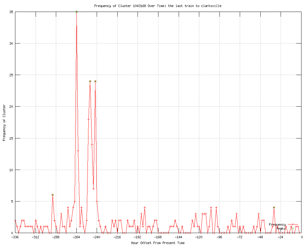 | 8 | the last train to clarksville Urls http://webpronews.com/davy-jones-dead-2012-02 http://wik.io/info/US/317630558 http://allieiswired.com/archives/2012/02/davy-jones-of-the-monkees-dead-at-66/ http://blog.devshirme.com/2012/02/davy-jones-rip/ http://ChicagoTribune.feedsportal.com/c/34253/f/622826/s/1d0d27f1/l/0L0Schicagotribune0N0Cnews0Ccolumnists0Cct0Emet0Ekass0E0A30A10E20A120A30A10H0A0H4827990Bcolumn0Dtrack0Frss/story01.htm http://findata.co.nz/News/14792937/Being_a_believer_is_a_little_bit_me_and_a_little_bit_you.htm http://chicagotribune.com/news/columnists/ct-met-kass-0301-20120301,0,482799.column?track=rss http://chicagotribune.com/news/columnists/ct-met-kass-0301-20120301,0,482799.column |