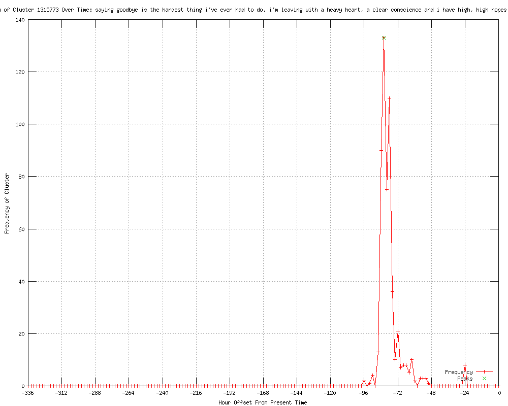 | 9 | saying goodbye is the hardest thing i've ever had to do. i'm leaving with a heavy heart, a clear conscience and high, high hopes for the future Urls http://wnep.com/sns-rt-us-crime-blagojevichbre82e13u-20120315,0,6993943.story http://wkzo.com/news/articles/2012/mar/15/cameras-in-tow-blagojevich-surrenders-to-prison/ http://reuters.com/article/2012/03/15/us-crime-blagojevich-idUSBRE82E13U20120315?feedType=RSS&feedName=domesticNews http://feeds.reuters.com/~r/Reuters/domesticNews/~3/yM1oBYwP-vY/us-crime-blagojevich-idUSBRE82E13U20120315 http://kgmi.com/Cameras-in-tow-Blagojevich-surrenders-to-prison/11461869?newsId=132587 http://reuters.com/article/2012/03/15/us-crime-blagojevich-idUSBRE82E13U20120315 http://my.news.yahoo.com/cameras-tow-blagojevich-begins-prison-sentence-213623504.html http://moneycontrol.com/news/wire-news/camerastow-blagojevich-begins-prison-sentence_681084.html http://in.reuters.com/article/2012/03/15/crime-blagojevich-idINDEE82E0JG20120315?feedType=RSS&feedName=worldNews |