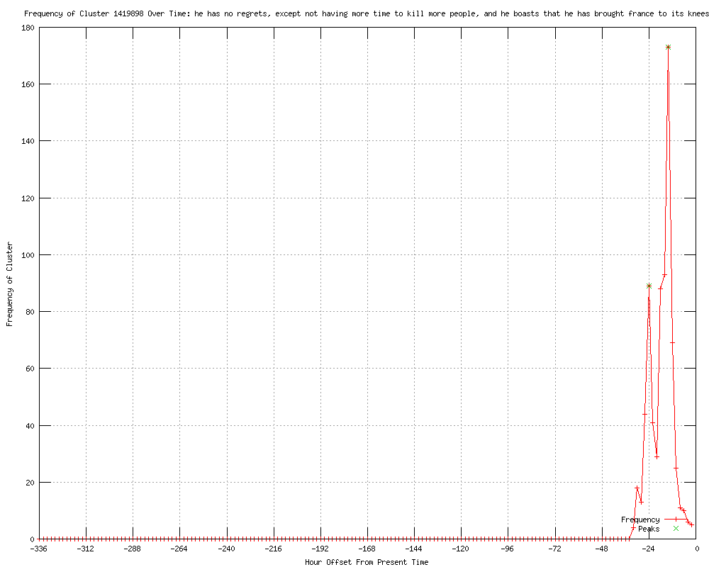 | 484 | he has no regrets, except not having more time to kill more people and he boasts that he has brought france to its knees Urls http://globalindigo.com/suspected-french-serial-killer-under-siege http://irishtimes.com/newspaper/breaking/2012/0321/breaking2.html http://ca.news.yahoo.com/french-police-swoop-suspects-school-killings-040326838.html http://feeds.cbsnews.com/~r/CBSNewsMain/~3/baCrWggWVQI/ http://cbsnews.com/8301-202_162-57402124/siege-of-french-killings-suspect-enters-2nd-day/ http://feeds.cbsnews.com/%7Er/CBSNewsTravelGuru/%7E3/baCrWggWVQI/ http://uk.news.yahoo.com/french-police-swoop-suspects-school-killings-040326838.html http://mail.com/news/world/1148088-3-blasts-hideout-french-terror-suspect.html http://hosted.ap.org/dynamic/stories/E/EU_FRANCE_SCHOOL_SHOOTINGS?SITE=TXDAM&SECTION=HOME&TEMPLATE=DEFAULT&CTIME=2012-03-21-18-45-25 http://news.yahoo.com/3-blasts-outside-hideout-french-terror-suspect-224535888.html http://guardian.co.uk/world/feedarticle/10156413 http://guardian.co.uk/world/feedarticle/10156404 http://statesman.com/news/nation/3-blasts-outside-hideout-of-french-terror-suspect-2251832.html http://whbf.com/story/17210920/prosecutor-french-shooter-was-planning-new-attack http://cbs8.com/story/17214908/prosecutor-french-shooter-proud-of-the-7-slayings http://amusinghistorymusings.blogspot.com/2012/03/prosecutor-french-shooter-proud-of-7.html http://guardian.co.uk/world/feedarticle/10156472 http://kdwn.com/index.php?page=2§ion=TOP_NEWS&title=3_blasts_outside_hideout_of_French_terror_suspect http://kdwn.com/index.php?page=2§ion=WORLD_NEWS&title=3_blasts_outside_hideout_of_French_terror_suspect http://news-sentinel.com/apps/pbcs.dll/article?AID=/20120321/NEWS/120329930/1006/YOURVOICE_OPINION http://mail.com/news/world/1148088-french-riot-police-pressure-gunman-to-surrender.html http://cjme.com/content/french-riot-police-pressure-gunman-surrender http://newsok.com/3-blasts-outside-hideout-of-french-terror-suspect/article/feed/362437?custom_click=rss http://wric.com/story/17207016/french-riot-police-pressure-gunman-to-surrender http://newstalk650.com/content/french-riot-police-pressure-gunman-surrender http://news.yahoo.com/french-riot-police-pressure-gunman-surrender-234903898.html http://guardian.co.uk/world/feedarticle/10156488 http://ajc.com/news/nation-world/french-riot-police-pressure-1393441.html?cxtype=rss_news_82109 http://kdwn.com/index.php?page=2§ion=TOP_NEWS&title=French_riot_police_pressure_gunman_to_surrender http://kdwn.com/index.php?page=2§ion=WORLD_NEWS&title=French_riot_police_pressure_gunman_to_surrender http://seattlepi.com/news/article/3-blasts-outside-hideout-of-French-terror-suspect-3421704.php http://dailystar.com.lb/News/International/2012/Mar-22/167559-french-police-lay-siege-to-shooters-residence.ashx http://nrtoday.com/article/20120321/API/1203210552 http://time.com/time/world/article/0,8599,2109726,00.html?xid=rss-topstories&utm_source=feedburner&utm_medium=feed&utm_campaign=Feed%3A+time%2Ftopstories+%28TIME%3A+Top+Stories%29 http://theglobeandmail.com/news/world/french-police-set-off-explosions-to-pressure-suspected-gunman/article2376138/?utm_medium=Feeds%3A%20RSS%2FAtom&utm_source=Home&utm_content=2376138 http://guardian.co.uk/world/feedarticle/10156531 http://guardian.co.uk/world/feedarticle/10156509 http://urbanchristiannews.com/ucn/2012/03/french-police-in-tense-standoff-with-jewish-school-shooting-suspect.html http://seattlepi.com/news/article/French-riot-police-pressure-gunman-to-surrender-3421704.php http://syracuse.com/news/index.ssf/2012/03/french_riot_police_pressure_gu.html http://independent.co.uk/news/world/europe/french-riot-police-pressure-gunman-to-surrender-7579560.html http://theglobeandmail.com/news/world/french-police-set-off-explosions-to-pressure-suspected-gunman/article2376138/?utm_medium=Feeds%3A%20RSS%2FAtom&utm_source=World&utm_content=2376138 http://charlotteobserver.com/2012/03/21/3114631/french-minister-suspect-says-hell.html#storylink=rss http://kdwn.com/index.php?page=2§ion=WORLD_NEWS&title=New_blasts_in_suspects_standoff_vs._French_police http://guardian.co.uk/world/feedarticle/10156616 http://nbc-2.com/story/17215595/2012/03/21/french-riot-police-pressure-gunman-to-surrender http://theglobeandmail.com/news/world/french-police-set-off-second-round-of-blasts-to-pressure-suspected-gunman/article2376138/?utm_medium=Feeds%3A%20RSS%2FAtom&utm_source=World&utm_content=2376138 http://news.yahoo.com/french-police-press-besieged-gunman-surrender-010603721.html http://kcby.com/news/national/French-police-press-besieged-gunman-to-surrender-143744596.html http://komonews.com/news/national/French-police-press-besieged-gunman-to-surrender-143744596.html http://.wsls.com/news/2012/mar/21/french-riot-police-pressure-gunman-to-surrender-ar-1784317/ http://mail.com/news/world/1148088-french-police-press-besieged-gunman-to-surrender.html http://cjme.com/content/french-police-press-besieged-gunman-surrender http://newsok.com/new-blasts-in-suspects-standoff-vs.-french-police/article/feed/362437?custom_click=rss http://newstalk650.com/content/french-police-press-besieged-gunman-surrender http://theglobeandmail.com/news/world/french-police-set-off-second-round-of-blasts-to-pressure-suspected-gunman/article2376138/?utm_medium=Feeds%3A%20RSS%2FAtom&utm_source=Home&utm_content=2376138 http://ajc.com/news/nation-world/french-police-press-besieged-1393441.html?cxtype=rss_news_82109 http://kdwn.com/index.php?page=2§ion=TOP_NEWS&title=French_police_press_besieged_gunman_to_surrender http://kdwn.com/index.php?page=2§ion=WORLD_NEWS&title=French_police_press_besieged_gunman_to_surrender http://seattlepi.com/news/article/French-police-press-besieged-gunman-to-surrender-3421704.php http://guardian.co.uk/world/feedarticle/10156640 http://guardian.co.uk/world/feedarticle/10156625 http://abc15.com/dpp/news/national/french-police-press-besieged-gunman-to-surrender http://newsday.com/news/world/french-police-press-besieged-gunman-to-su