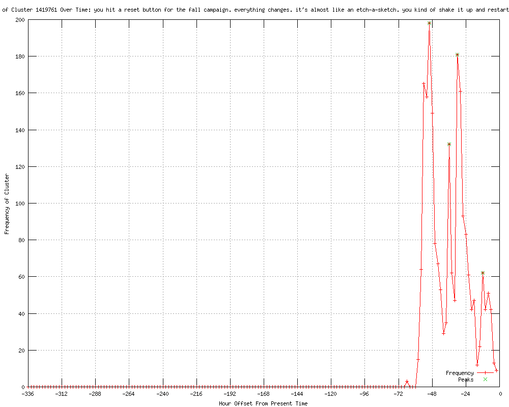 | 34 | everything changes. it's almost like an etch a sketch. you can kind of shake it up and we start all over again Urls http://nbcwashington.com/blogs/first-read-dmv/Etch-A-Sketch-Shakes-Campaign-Rattles-Romney-143717676.html http://newsmax.com/Newsfront/001513NODE-001565NODE-001575NODE-2500/2012/03/21/id/433419 http://us.rd.yahoo.com/finance/external/bloomberg/rss/SIG=13cqimg6v/*http://www.bloomberg.com/news/2012-03-21/romney-beats-santorum-in-illinois-as-long-race-remains-ahead.html?cmpid=yhoo http://post-gazette.com/stories/news/politics-national/romney-feels-momentum-carrying-him-to-nomination-627396/ http://latimes.com/news/politics/la-pn-romney-etch-a-sketch-20120321,0,2407636.story?track=rss http://latimes.com/news/la-pn-romney-etch-a-sketch-20120321,0,2437464.story?track=rss http://latimes.com/news/politics/la-pn-romney-campaign-failing-to-shake-off-etch-a-sketch-label-20120321,0,7348129.story?track=rss http://vixenstrangelymakesuncommonsense.blogspot.com/2012/03/unenviable-branding-genius-of-eric.html http://nypost.com/p/news/national/jeb_mitt_man_Av6bUPKW28pUz2vFktg9jJ?utm_medium=rss&utm_content=National http://conservativerefocus.com/blog5.php/2012/03/21/romney-camp-s-latest-verbal-blunder-may-be-etch-a-sketched-in-history http://feeds.huffingtonpost.com/~r/HP/media/~3/MXRRhODvdNA/john-mccain-etch-a-sketch_n_1373509.html http://nydailynews.com/news/election-2012/mitt-romney-wife-ann-damage-control-mode-eric-fehrnstrom-etch-a-sketch-gaffe-article-1.1048782?localLinksEnabled=false http://vcstar.com/news/2012/mar/22/milbank-romney-advisers-game-changer/?partner=RSS http://totalcapitol.com/?news_id=5006293&redirect=http://www.vcstar.com/news/2012/mar/22/milbank-romney-advisers-game-changer/?partner=RSS http://DecaturDaily.com/stories/In-praise-of-Etch-a-Sketch,93329 http://thinkprogress.org/romm/2012/03/22/449724/etch-a-sketch-in-2006-romney-touted-high-gasoline-prices-to-discourage-consumption/ http://patrickhenrypress.info/node/597419 http://northjersey.com/r?19=961&43=516422&44=143870516&32=4497&7=309037&40=http%3A%2F%2Fwww.northjersey.com%2Fnews%2Fopinions%2Fmilbank_032312.html http://courier-journal.com/article/20120323/OPINION04/303230021/Dana-Milbank-Etch-Sketch-gaffe-torments-Mitt-Romney?odyssey=nav|head http://courier-journal.com/article/20120323/OPINION04/303230021/Dana-Milbank-Etch-Sketch-gaffe-torments-Mitt-Romney?odyssey=mod|newswell|text|Home|s http://courier-journal.com/article/20120323/OPINION04/303230021/Dana-Milbank-Etch-A-Sketch-gaffe-torments-Mitt-Romney?odyssey=tab|mostpopular|text|FRONTPAGE http://courier-journal.com/article/20120323/OPINION04/303230021/Dana-Milbank-Etch-A-Sketch-gaffe-torments-Mitt-Romney?odyssey=tab|mostpopular|img|FRONTPAGE http://washingtonpost.com/blogs/post-partisan/post/fridays-p-op-quiz-etch-a-sketch-edition/2011/03/04/gIQAjFnMUS_blog.html?wprss=post-partisan http://thinkprogress.org/romm/2012/03/23/450555/romney-etch-a-sketch-eight-reasons-the-gaffe-will-endure/ http://patrickhenrypress.info/node/598544 http://sierraactivist.org/2012/03/23/romney-can-create-jobs-etch-a-sketch-sales-jump-1500-eight-reasons-the-gaffe-will-endure/?utm_source=rss&utm_medium=rss&utm_campaign=romney-can-create-jobs-etch-a-sketch-sales-jump-1500-eight-reasons-the-gaffe-will-endure http://huffingtonpost.com/joseph-romm/eight-reasons-the-etch-a-_b_1375697.html http://blogotariat.com/node/304027 http://facebookapplicationdevelopment.org/uncategorized/joseph-romm-eight-reasons-the-etch-a-sketch-gaffe-will-endure/ http://bangordailynews.com/2012/03/23/opinion/romneys-etch-a-sketch-gaffe/ http://allword-news.co.uk/2012/03/24/eight-reasons-the-etchasketch-gaffe-will-endure/ http://965kvki.com/mitt-romney-etch-a-sketch-sales-dollars-and-sense-video/ http://ksfa860.com/mitt-romney-etch-a-sketch-sales-dollars-and-sense-video/ http://newsradio95.com/mitt-romney-etch-a-sketch-sales-dollars-and-sense-video/ |