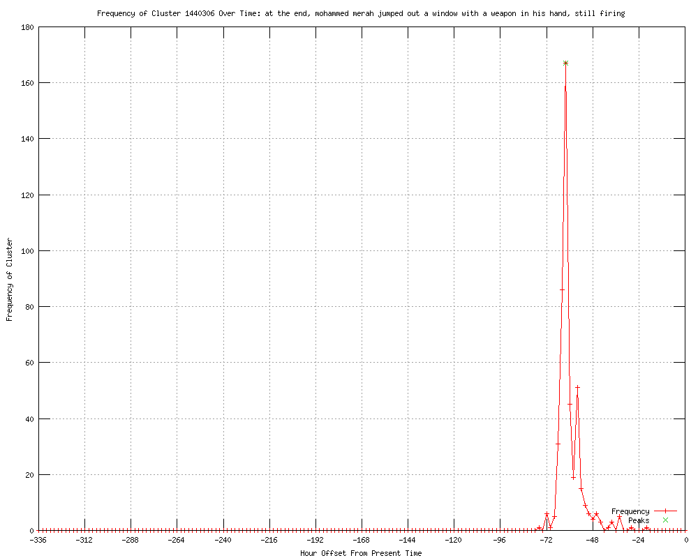 | 7 | at the end, mohammed merah jumped out a window with a weapon in his hand, still firing Urls http://ebz.by/info/US/321573671 http://algemeiner.com/2012/03/22/france-standoff-ends-with-death-of-mohammed-merah-killer-of-7/ http://aina.org/news/20120322152044.htm http://americanthinker.com/blog/2012/03/violent_end_to_french_standoff_with_muslim_murderer.html http://democraticunderground.com/101479830 http://progressivenewsdaily.com/?p=27802 http://newyorker.com/online/blogs/closeread/2012/03/everything-reminds-me-of-him-kandahar-sanford-toulouse.html |